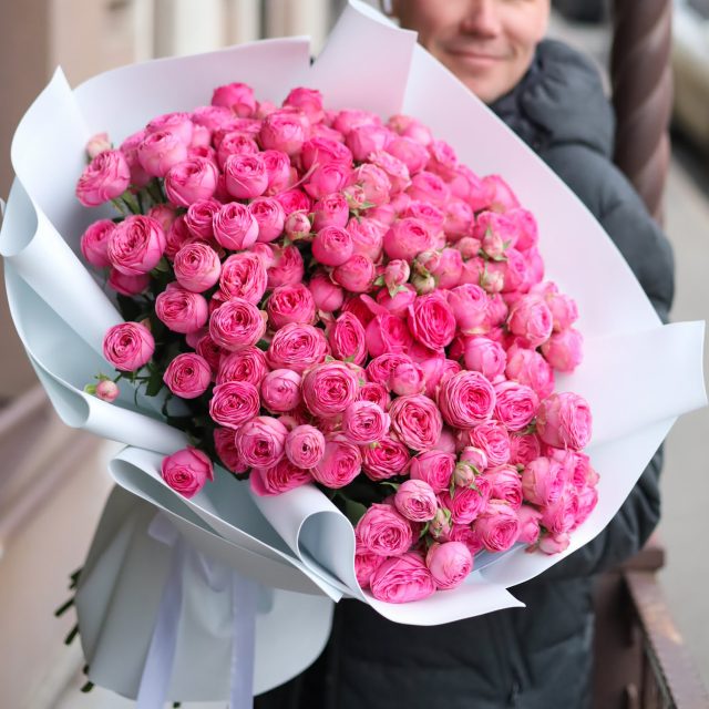 Великолепный большой букет кустовых пионовидных роз. Данный сорт отличается ярким цветом и крупным бутоном.
