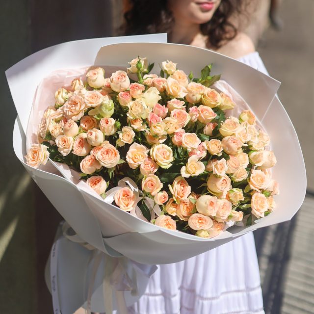 Великолепный объемный букет кустовых пионовидных роз нежно-персикового цвета в стильном оформлении.