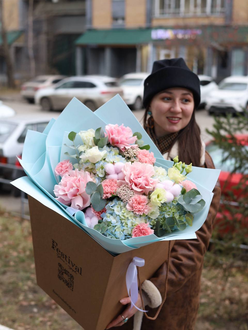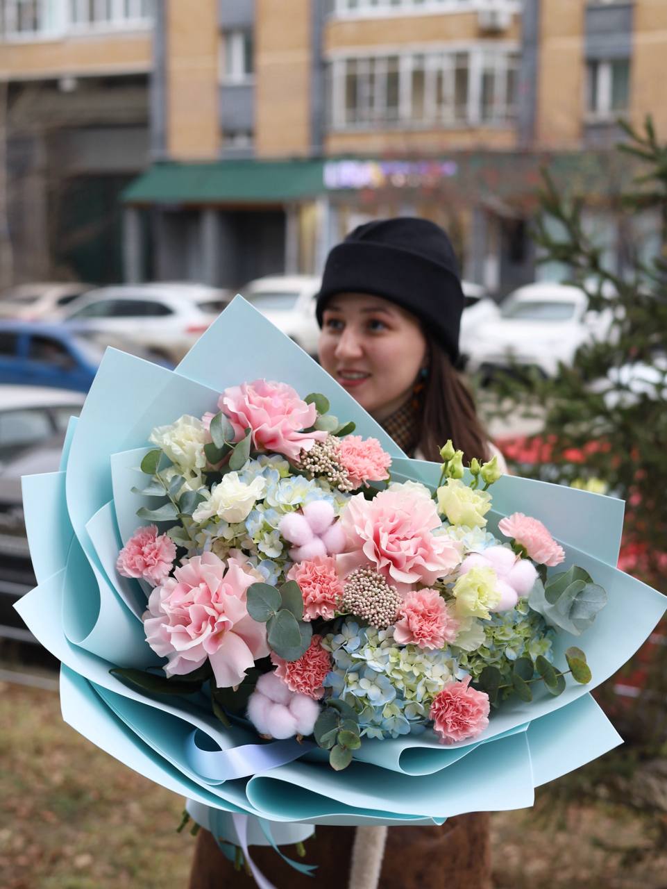 Великолепный объемный букет в нежной гамме с пышной голубой гортензией, французскими розами, стойкими диантусами, озатамнусом, эустомой и душистым эвкалиптом в оформлении.