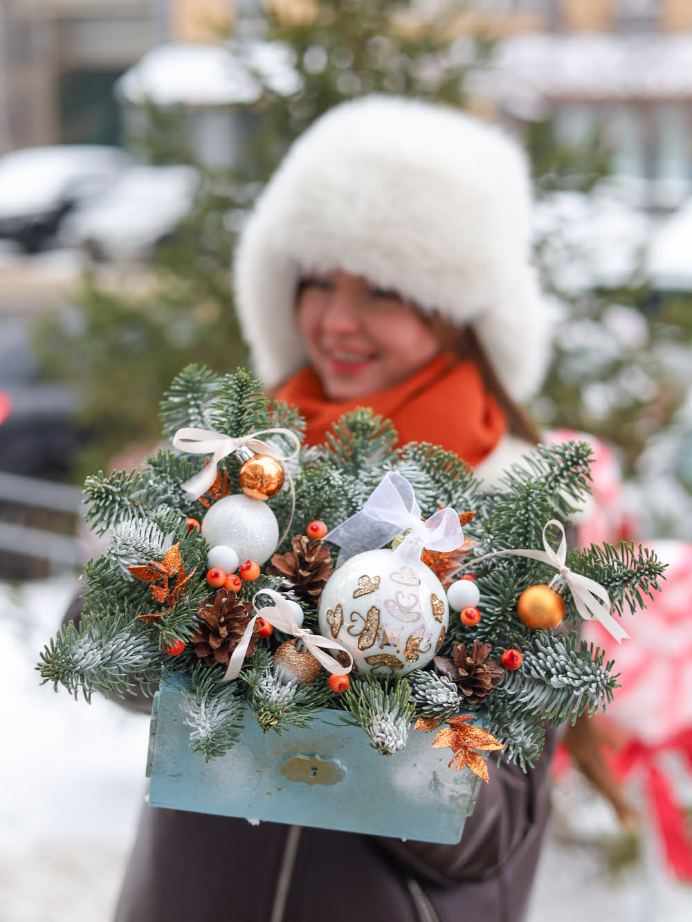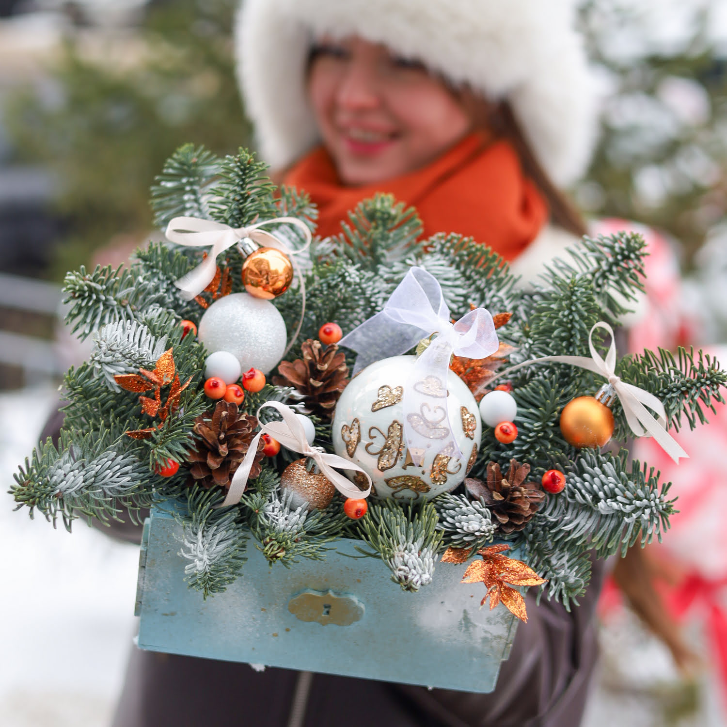 Состав: ель нобилис, шишки, ёлочные игрушки.