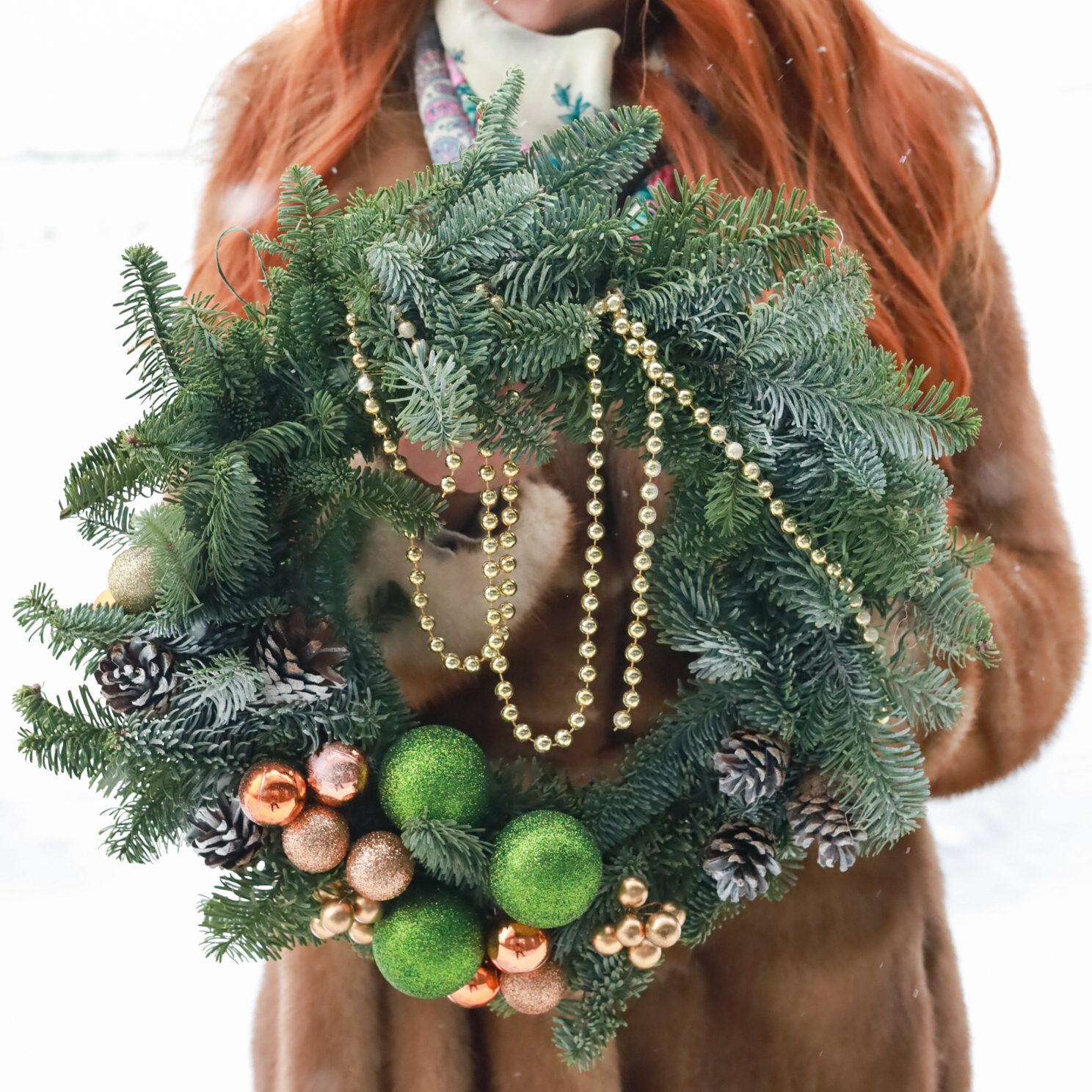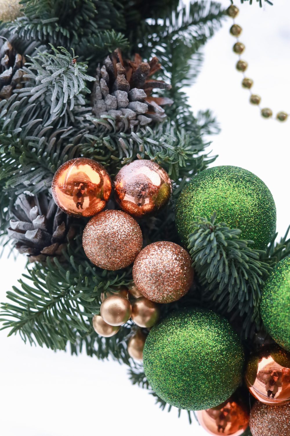 Рождественский венок из ароматной натуральной ели Нобилис, выполнен в золото-зеленой гамме.