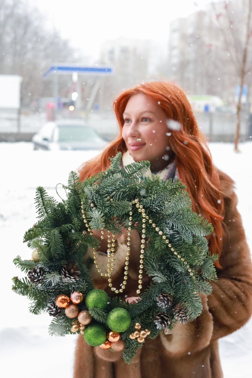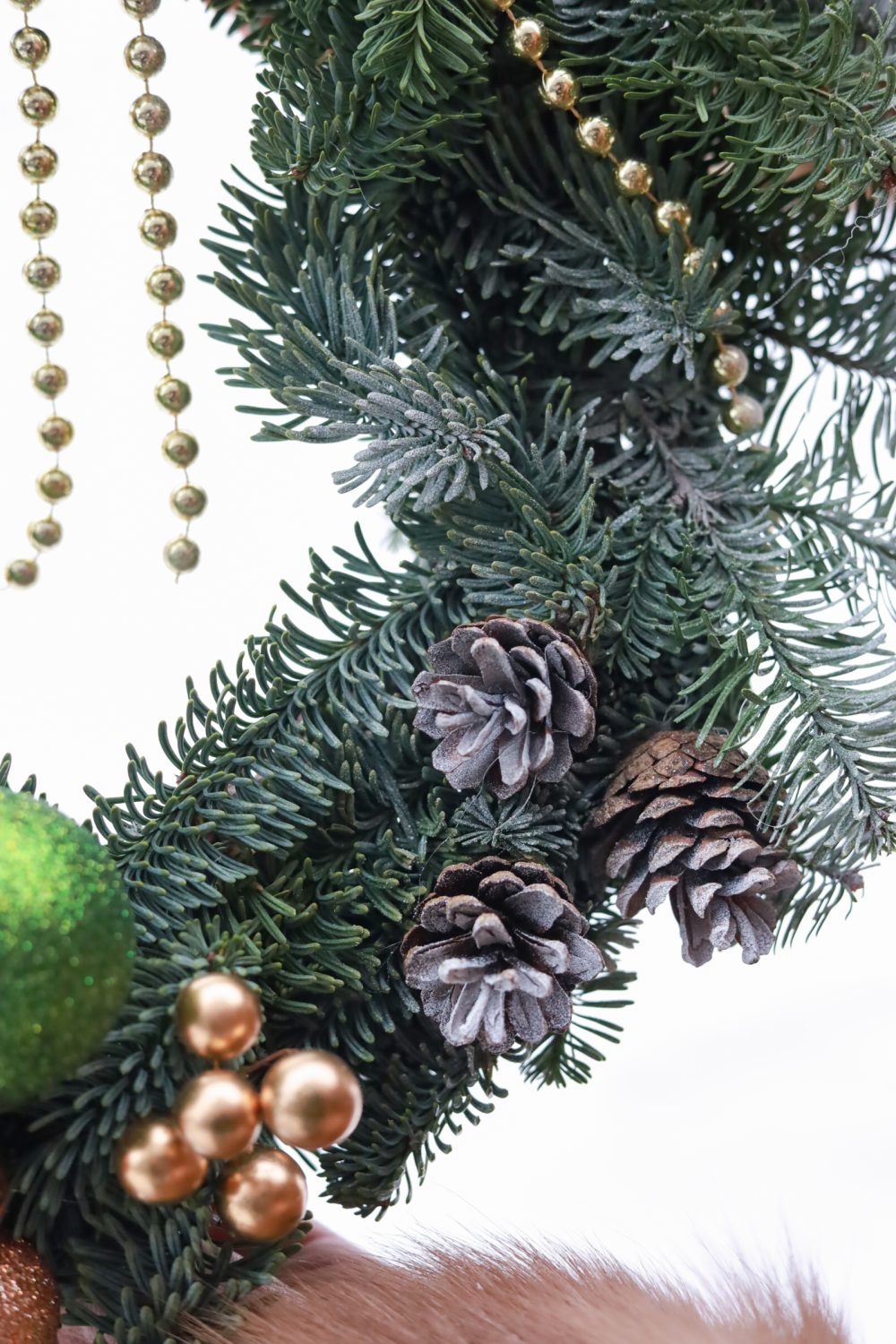 Состав: елочные игрушки, бусы, шишки.