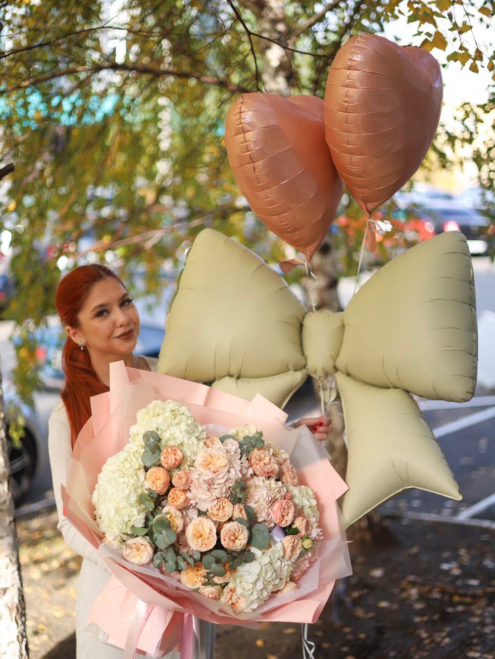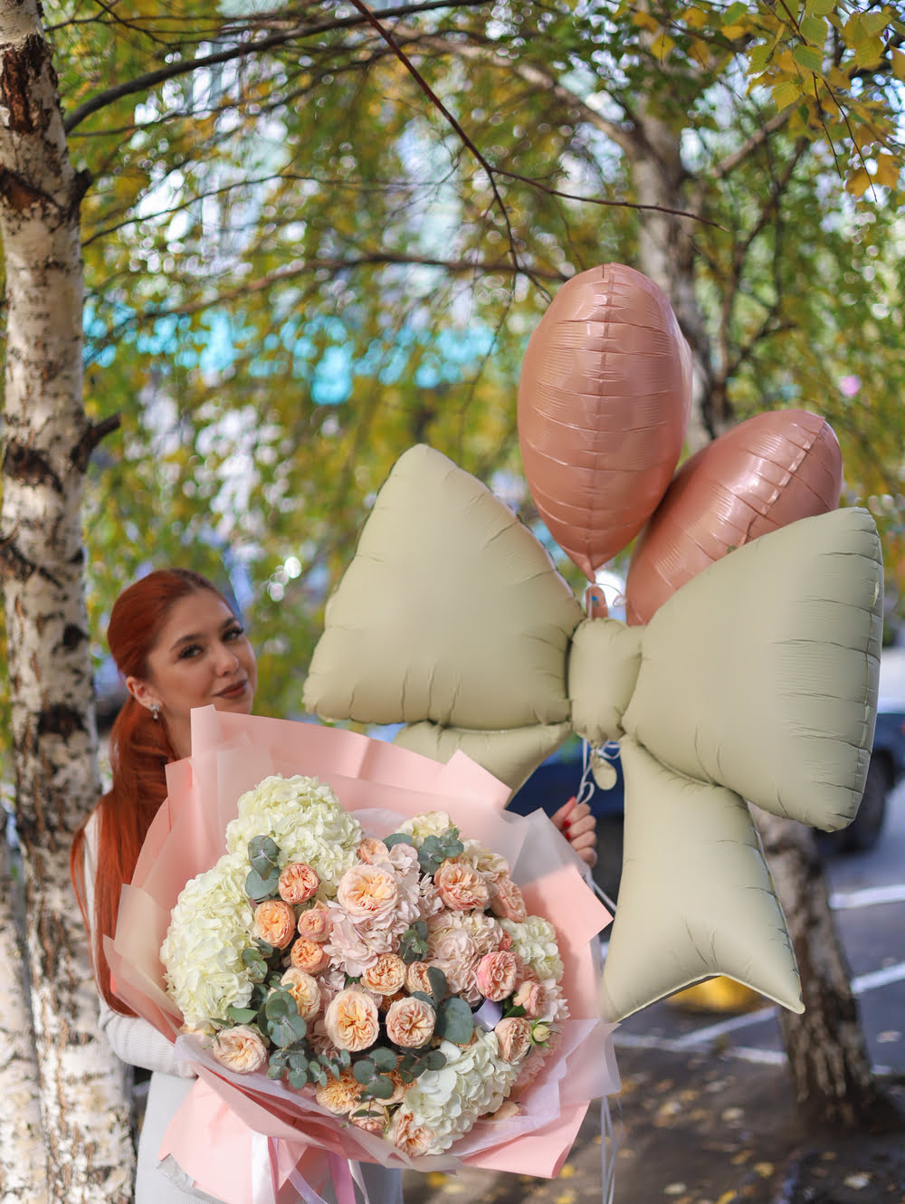 - роскошный авторский букет из пышных гортензий, крупных кустовых роз и эвкалипта