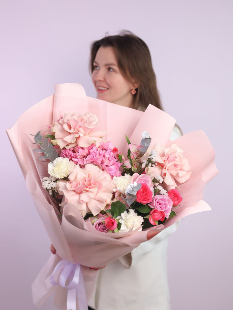 Красивый букет с французской розой, пышной гортензией, альстромерией, кустовой розой, статицей, стойким диантусом и эвкалиптом в оформлении.