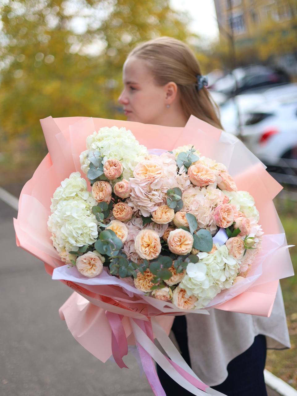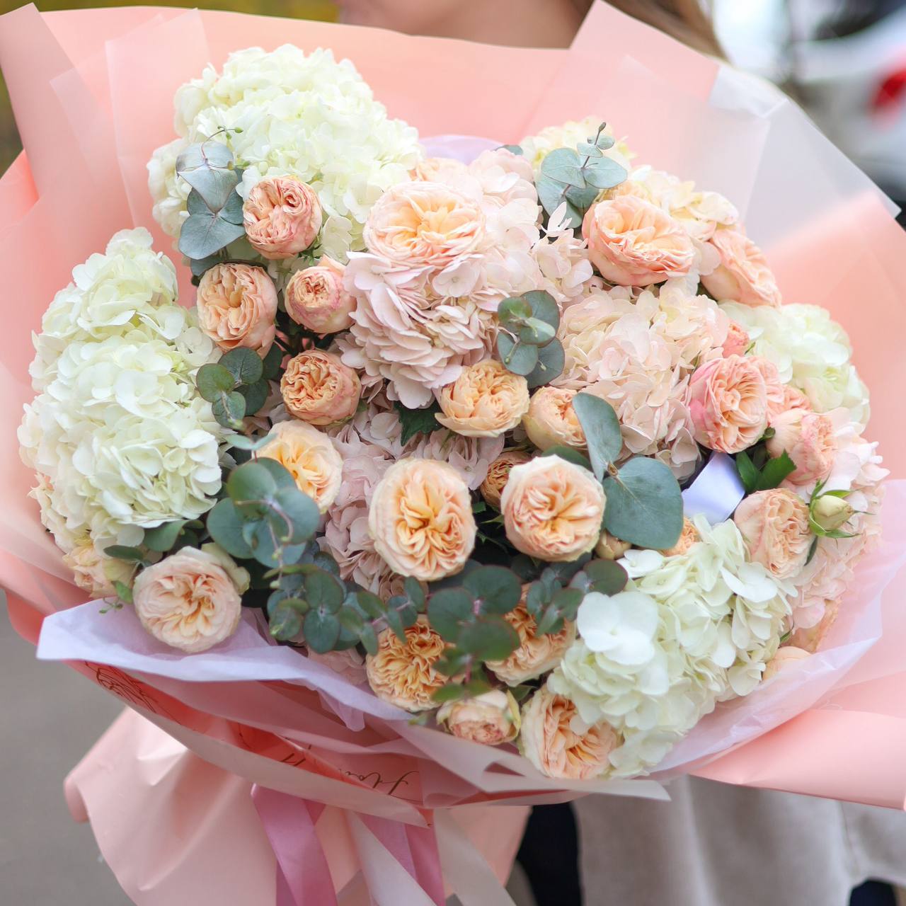 Букет пышных гортензий, кустовых пионовидных роз и душистого эвкалипта в оформлении.