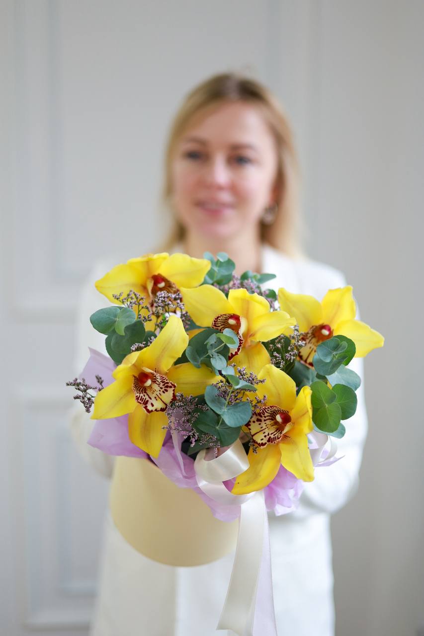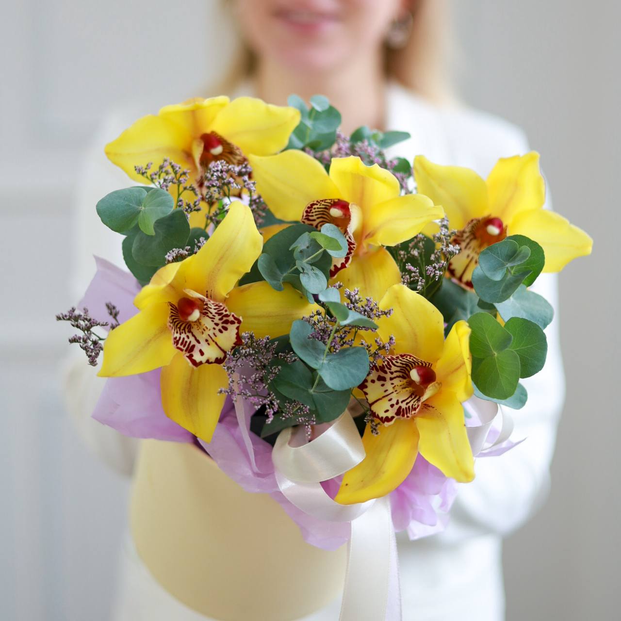 Композиция стойких орхидей, лимониума и эвкалипта в шляпной коробке.
