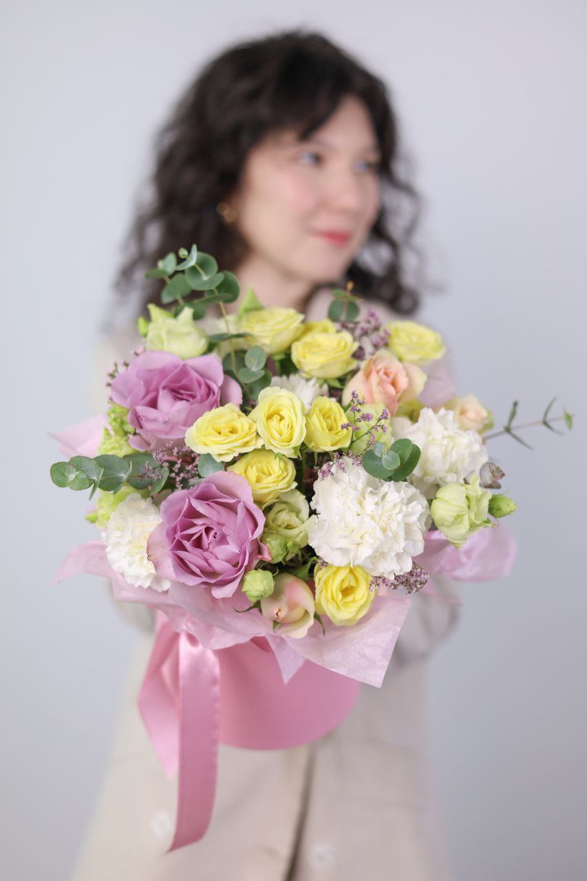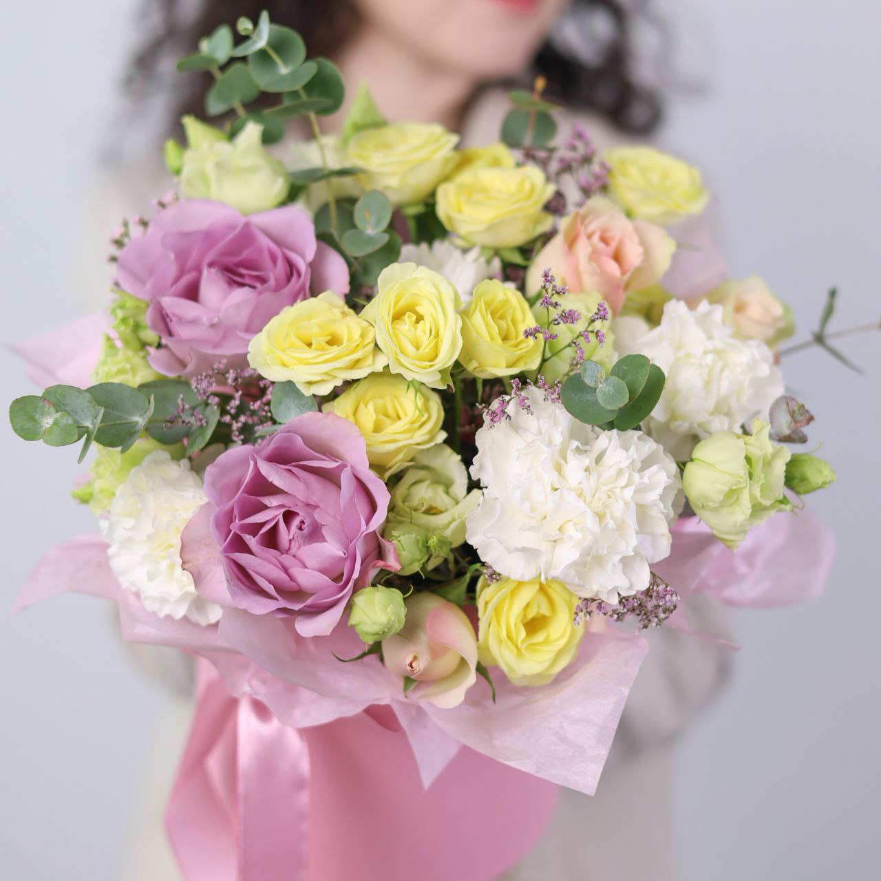 Яркая композиция с розами, стойкими диантусами и ароматным эвкалиптом в шляпной коробке.