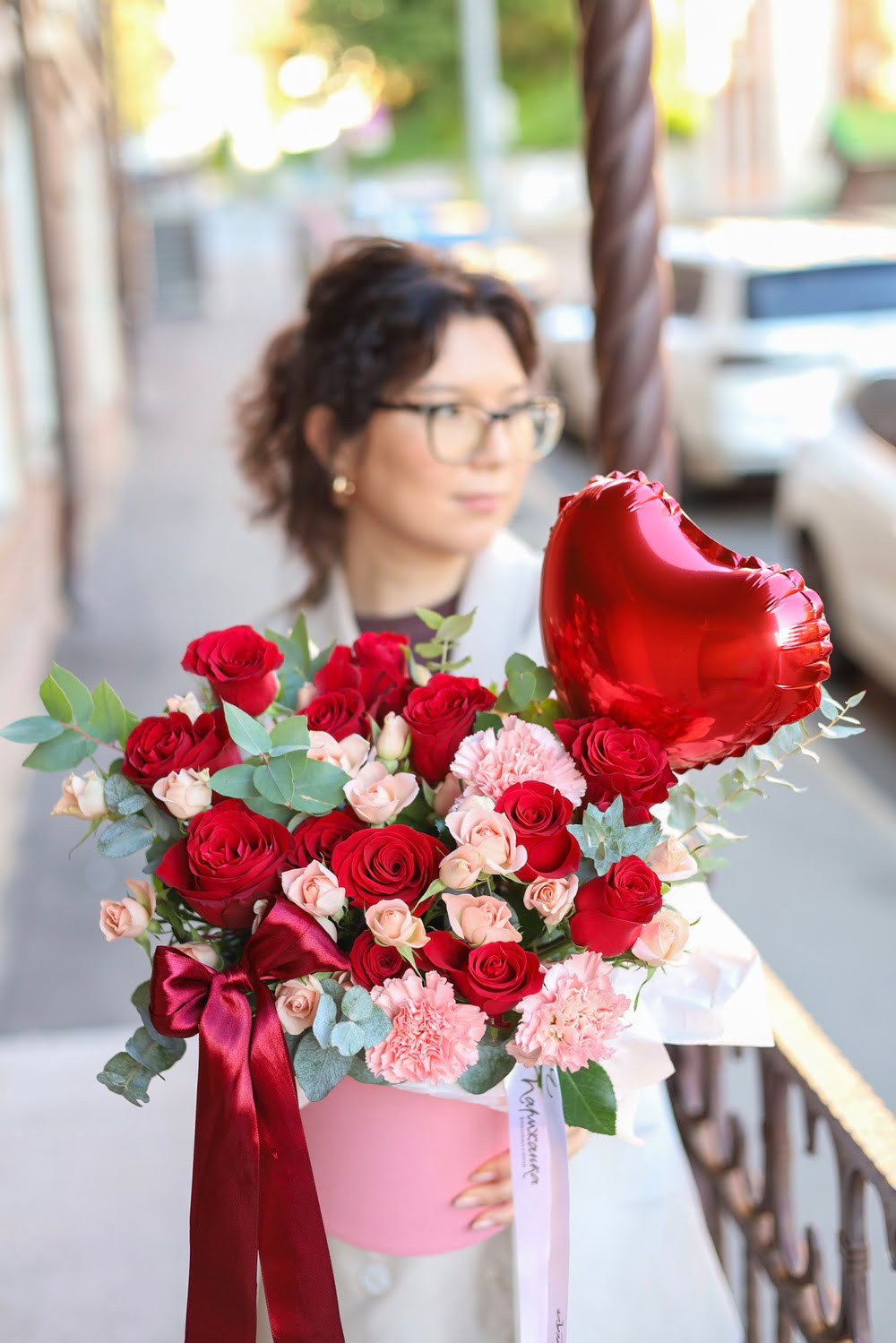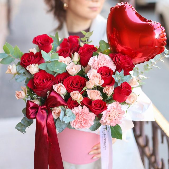 Состав: стойкие диантусы, одноголовые и кустовые розы, эвкалипт, шар.