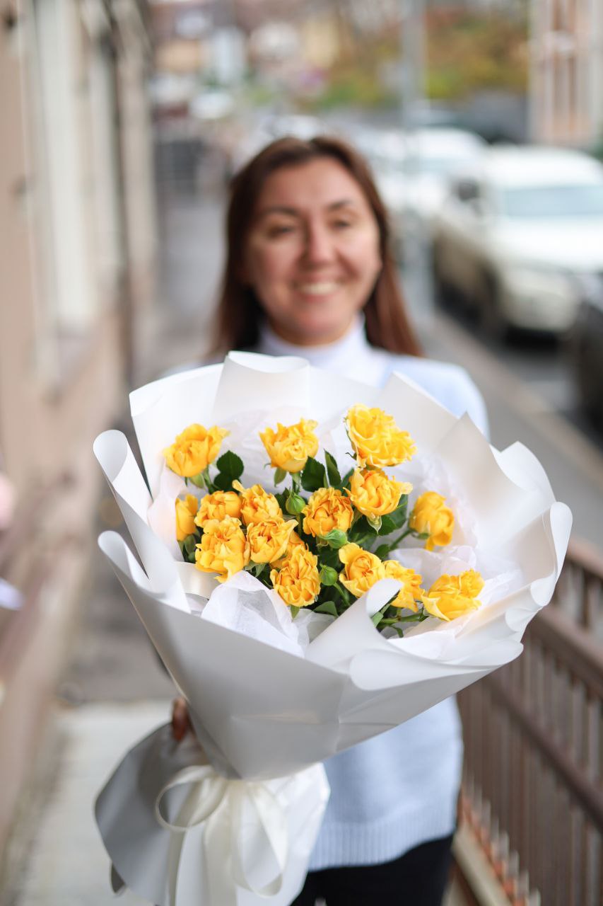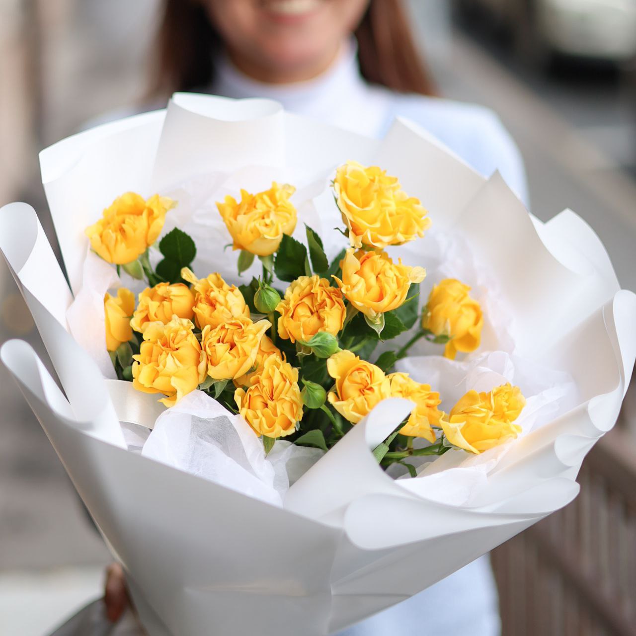 Букет в оформлении из высоких пионовидных кустовых роз.