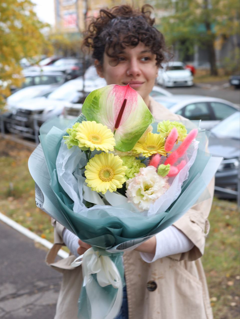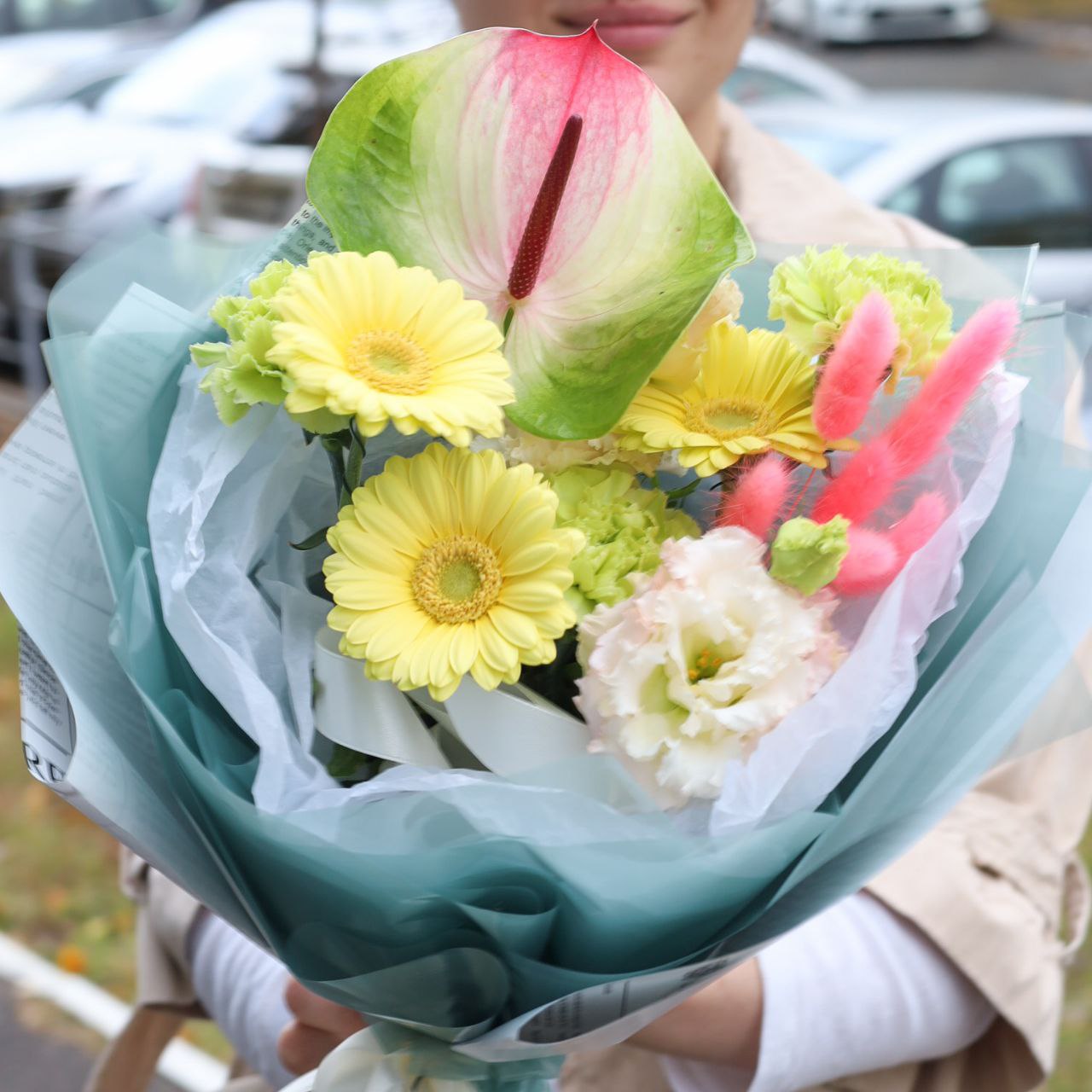 Букет с герберой, экзотическим антуриумом, эустомой и стойким диантусом в ярком оформлении.