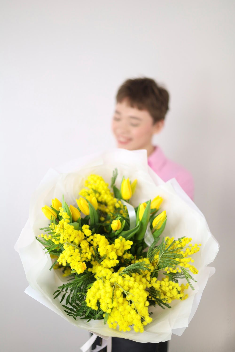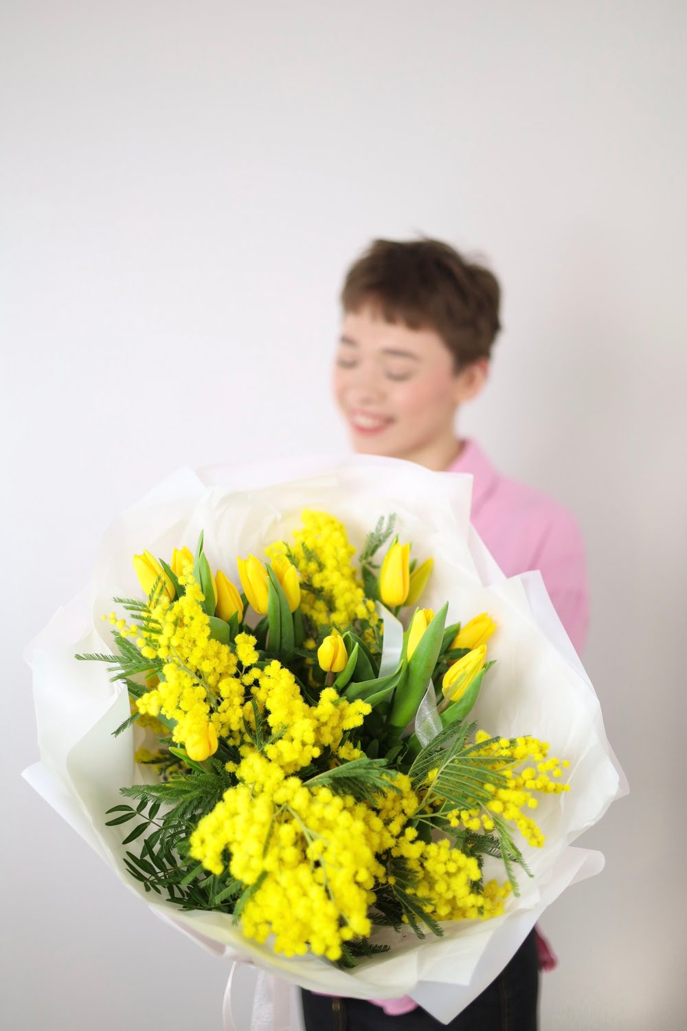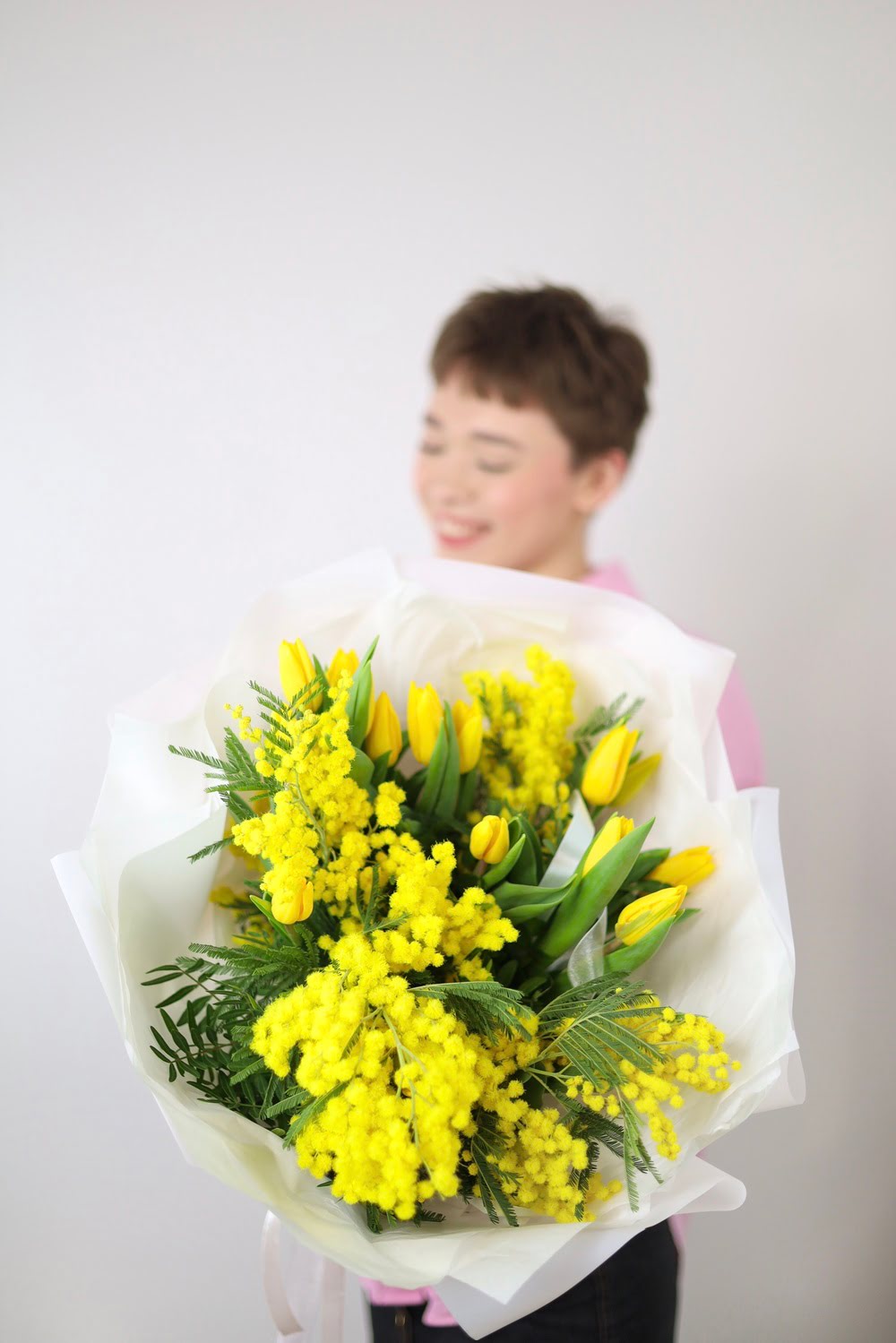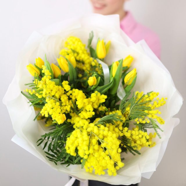 Очаровательный объемный букет из 15-ти желтых тюльпанов и пышной мимозы.