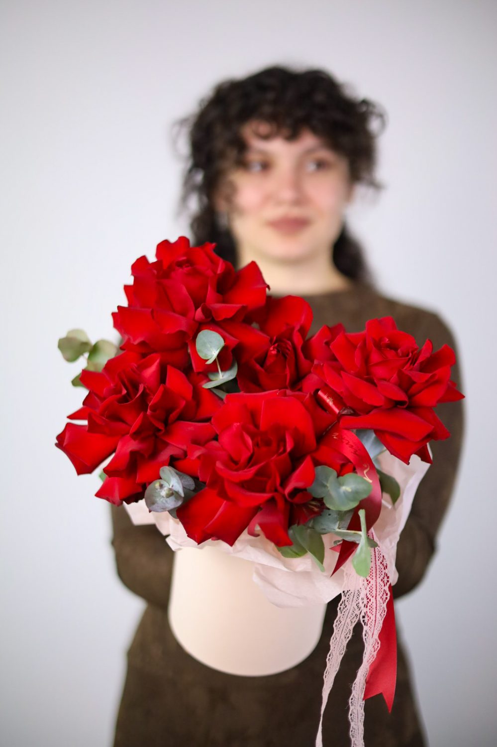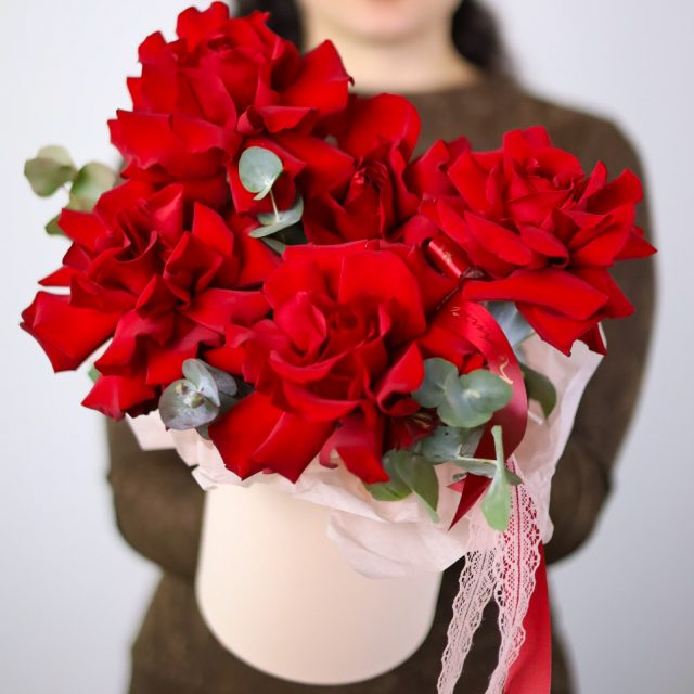 Прекрасная композиция с французскими розами и эвкалиптом.