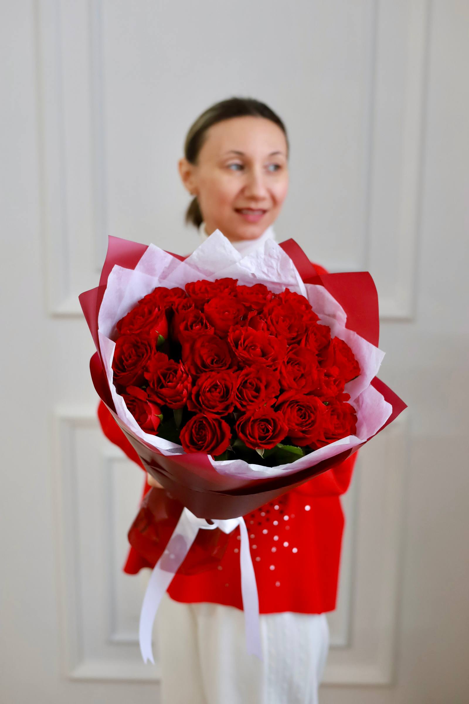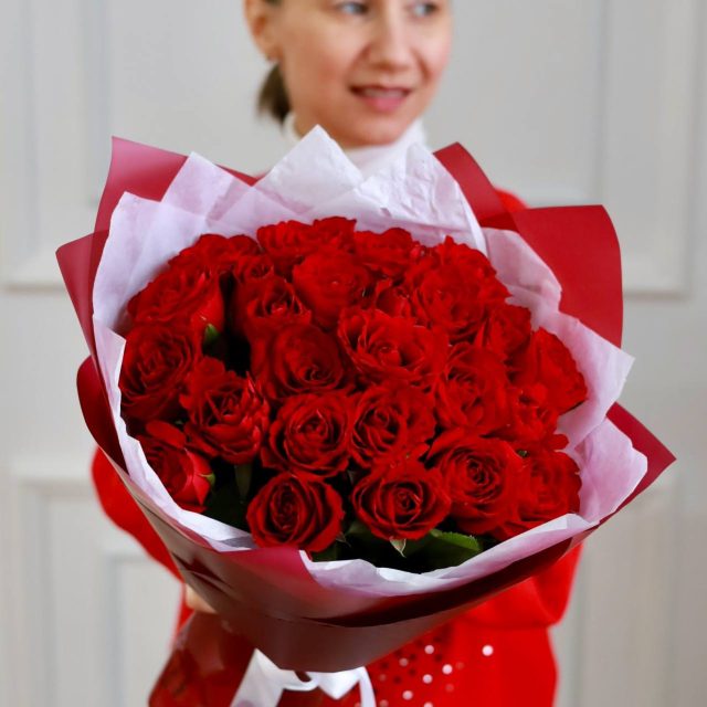 Чудесный букет из 25-ти красных розочек в стильном оформлении.