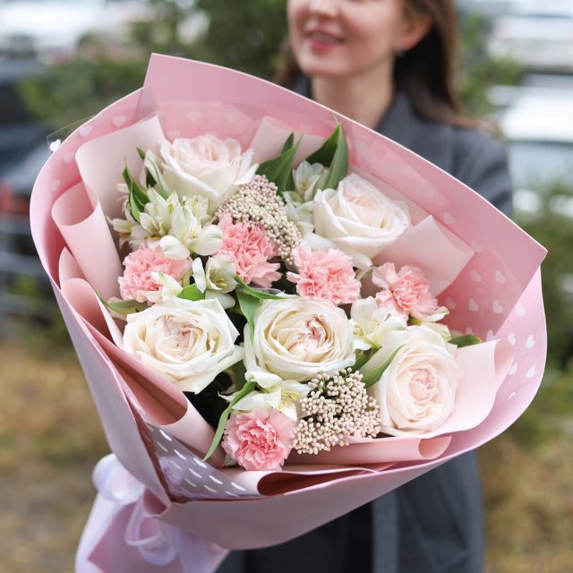 Прекрасный сборный букет в нежной гамме в оформлении.