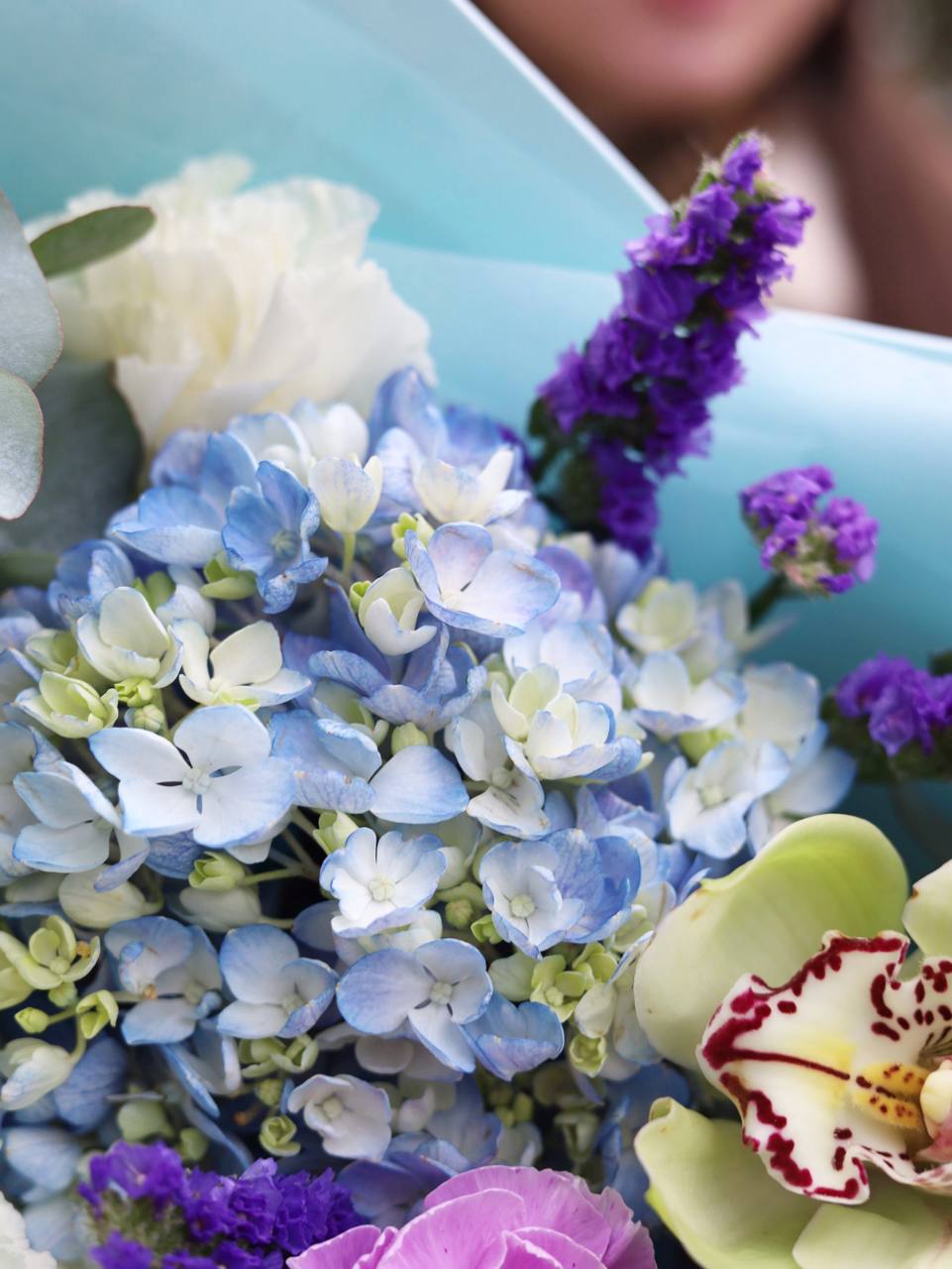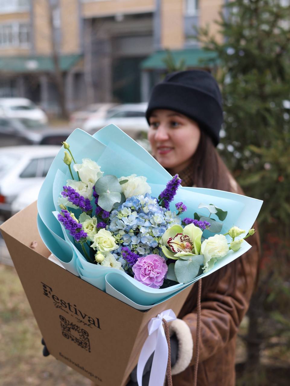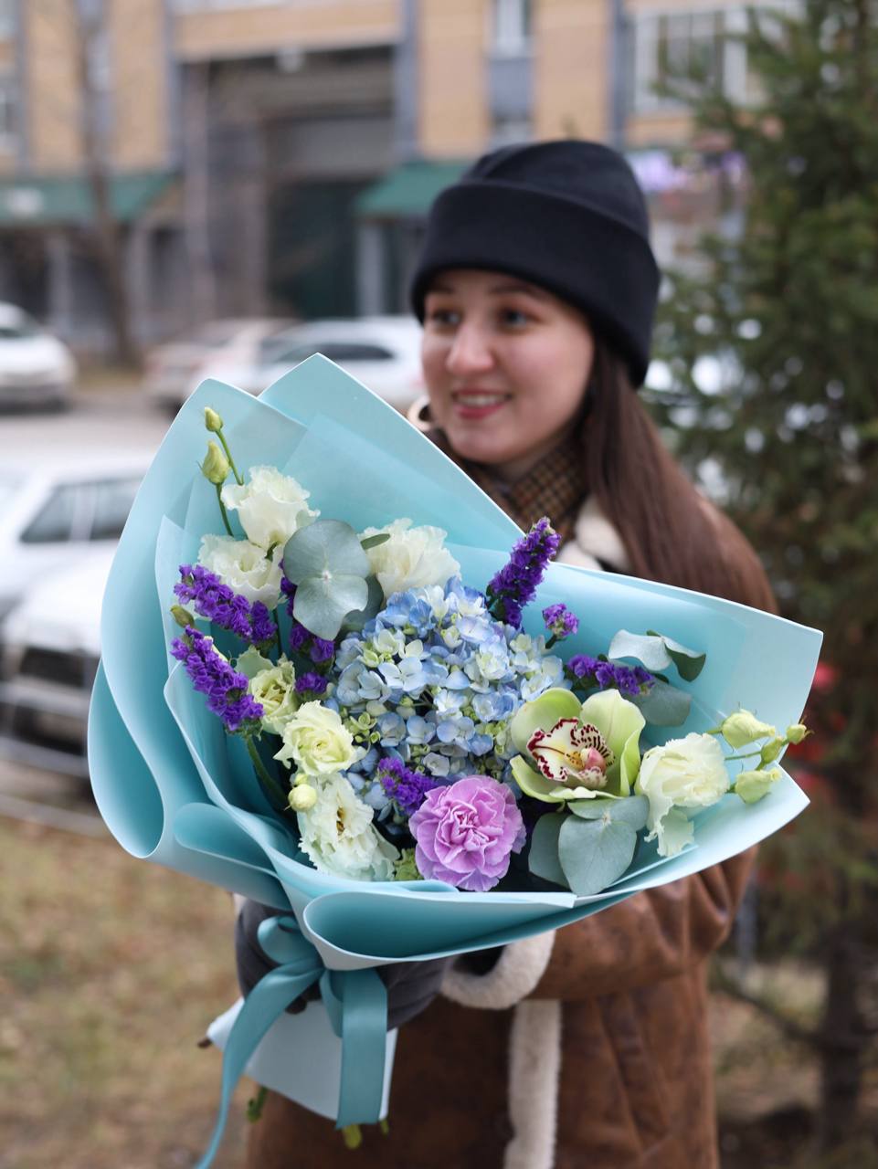 Очаровательный букет с пышной гортензией, ажурной эустомой, диантусами, статицей, орхидеей и душистым эвкалиптом.