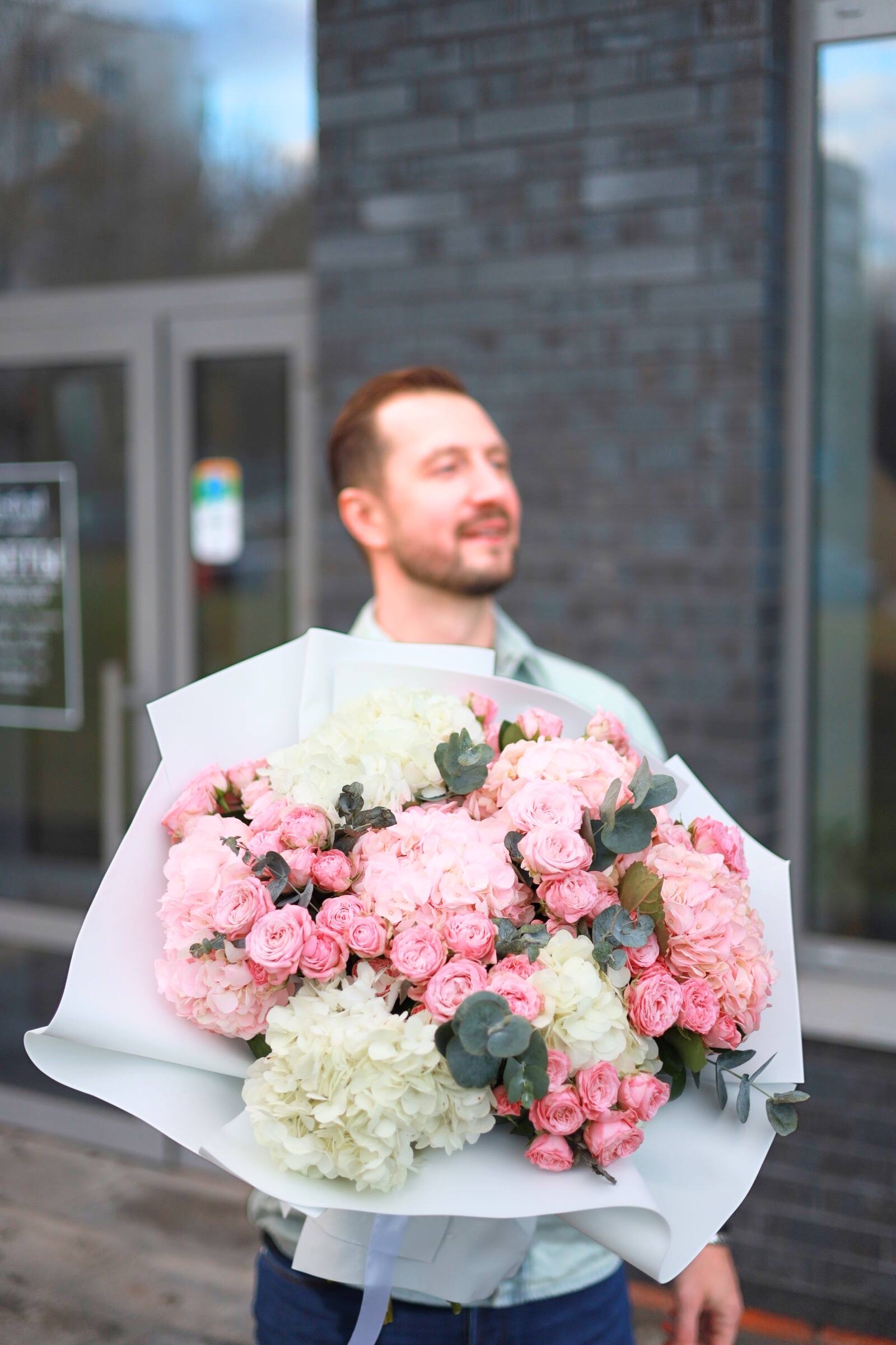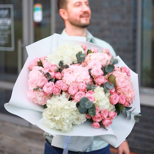 Состав: пышные гортензии, кустовые пионовидные розы, эвкалипт.