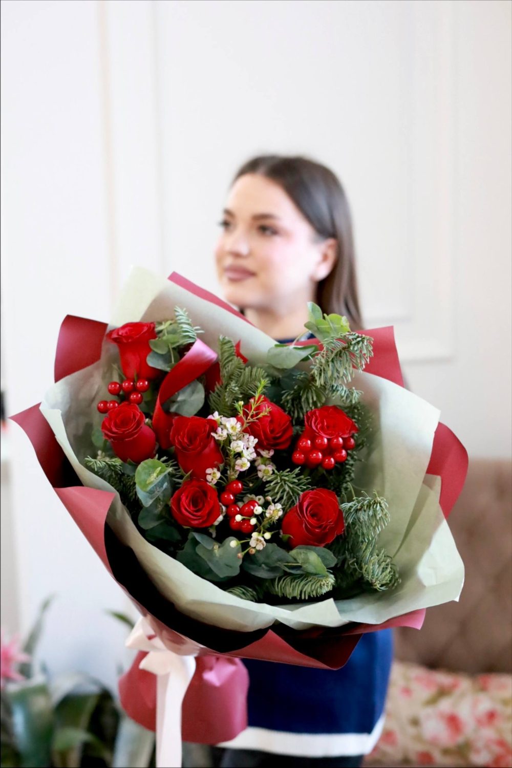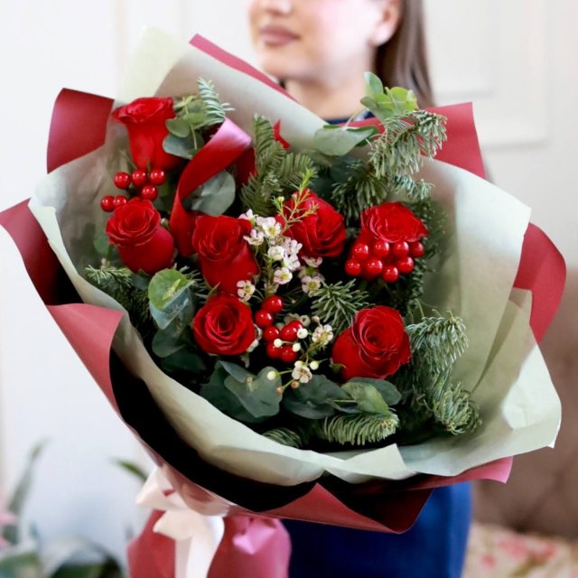 Красивый зимний букет в бордовой гамме в оформлении.
