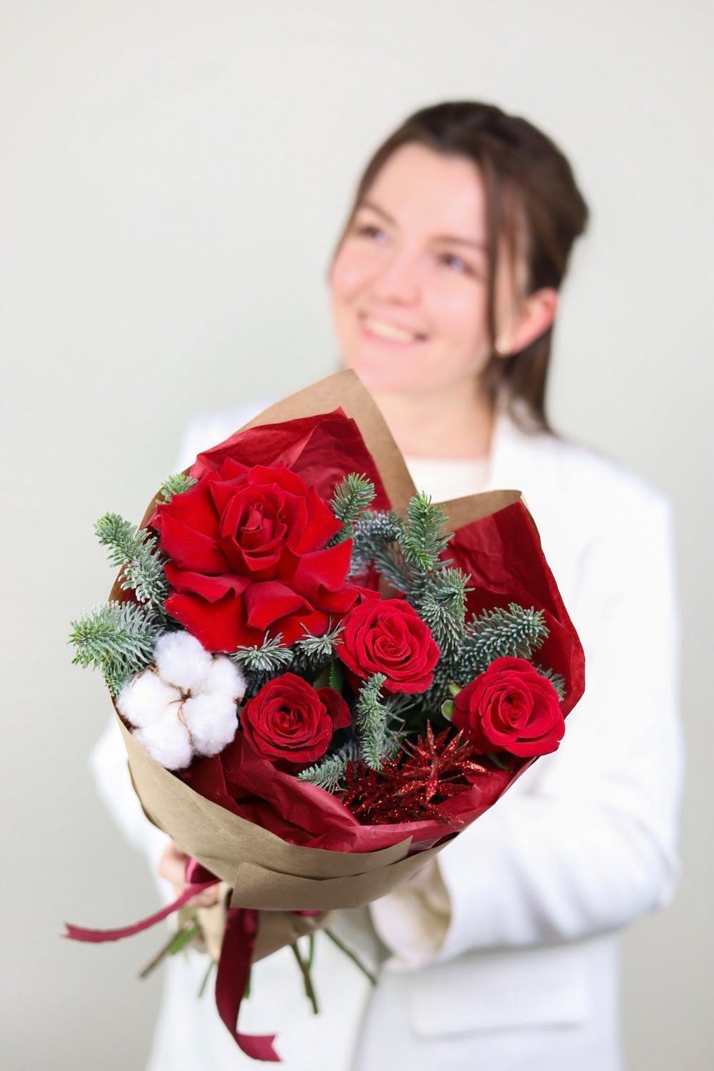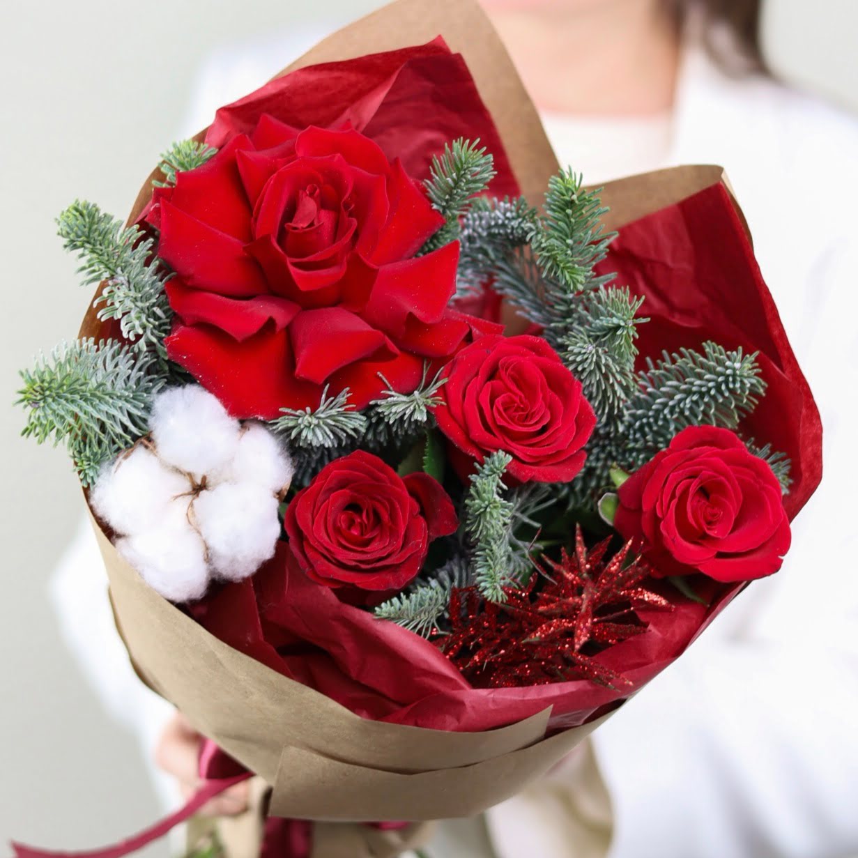 Красивый зимний букет в бордовой гамме в оформлении.