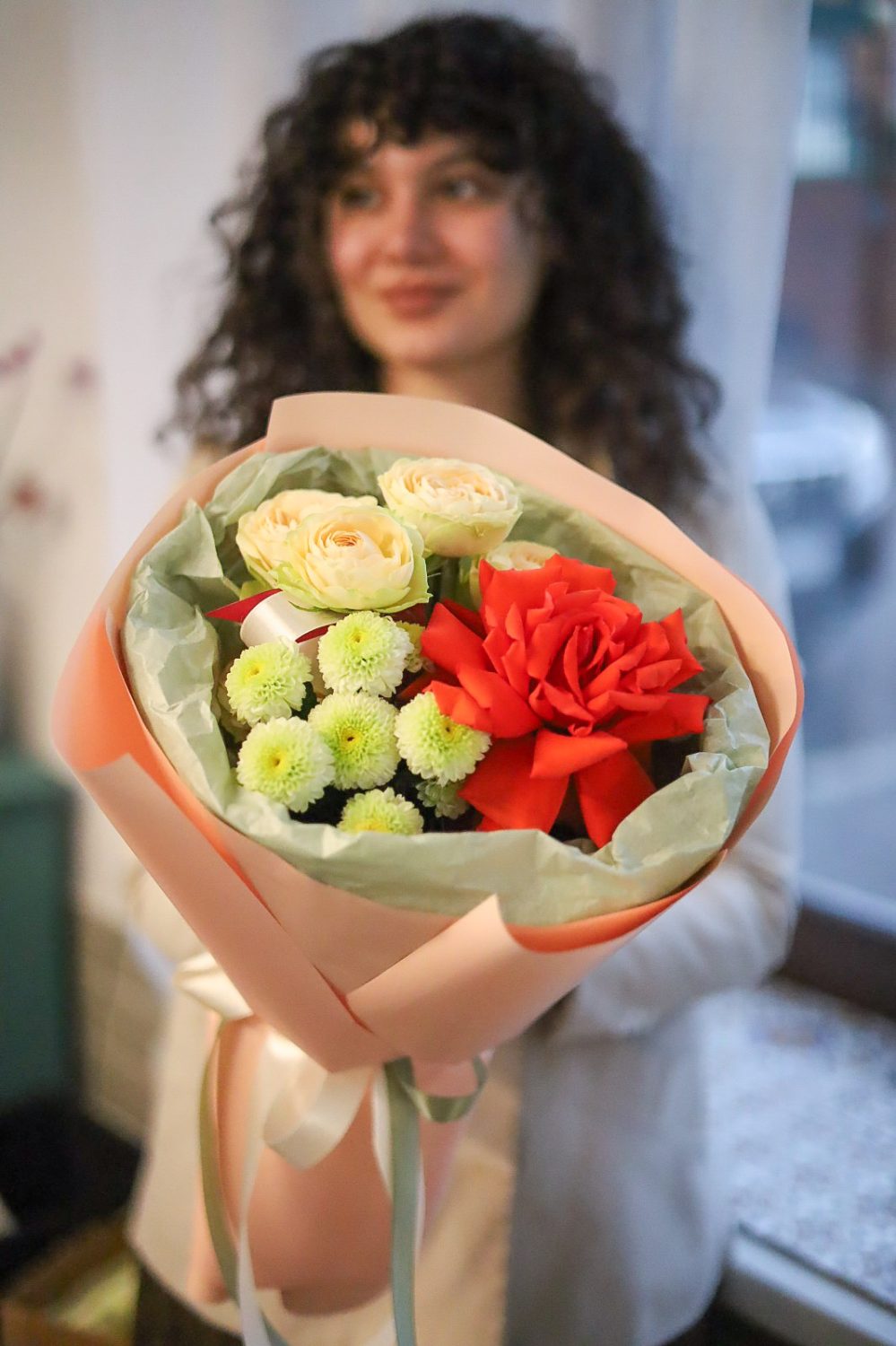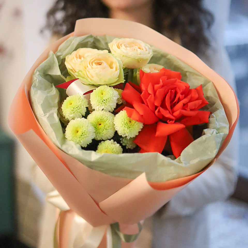 Милый букет с кустовыми пионовидными розами, стойкой хризантемой и французской розой.