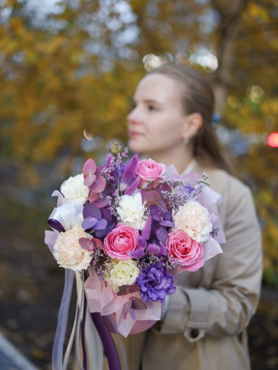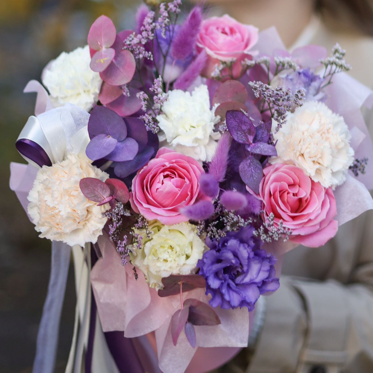 Композиция со стойкими диантусами, ажурной эустомой, розами и эвкалиптом в оформлении.