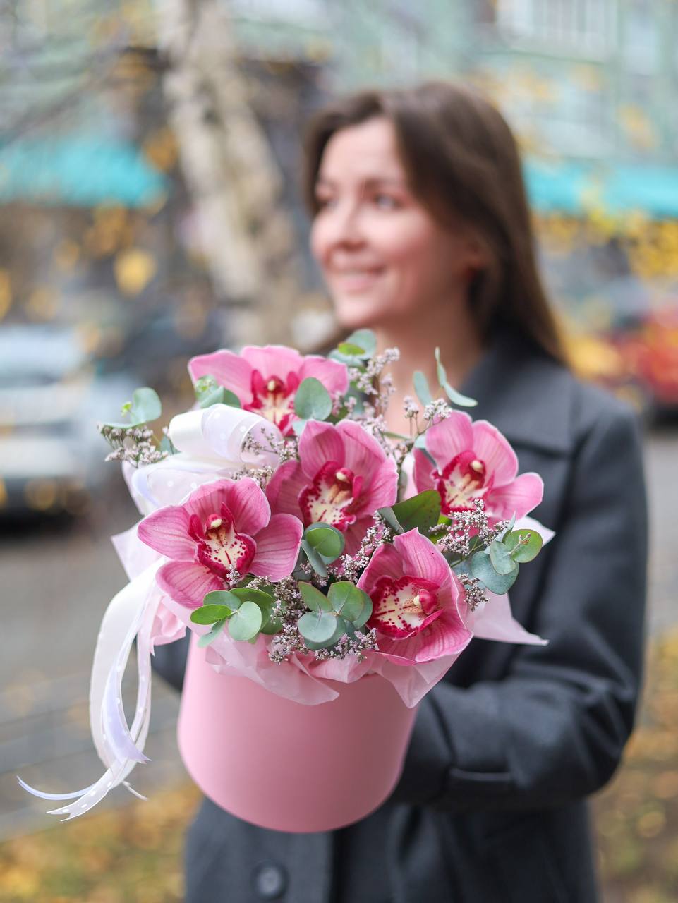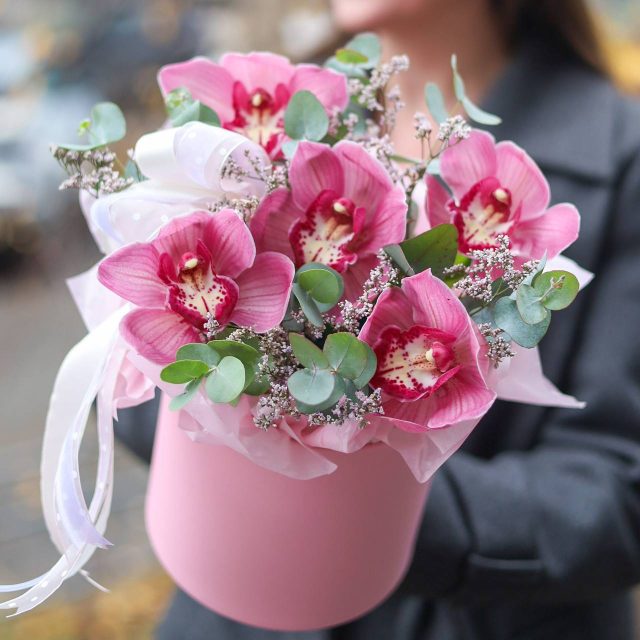 Композиция стойких орхидей, душистого эвкалипта и лимониума в шляпной коробке.