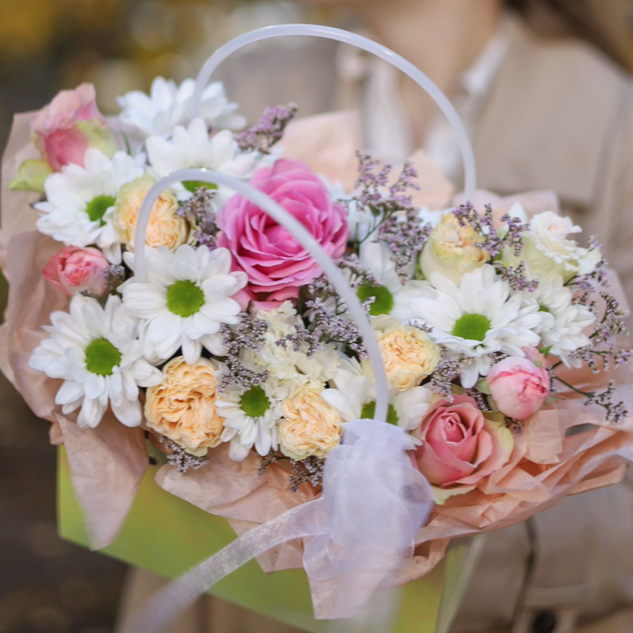 Композиция в сумочке с хризантемой, розой и лимониумом.