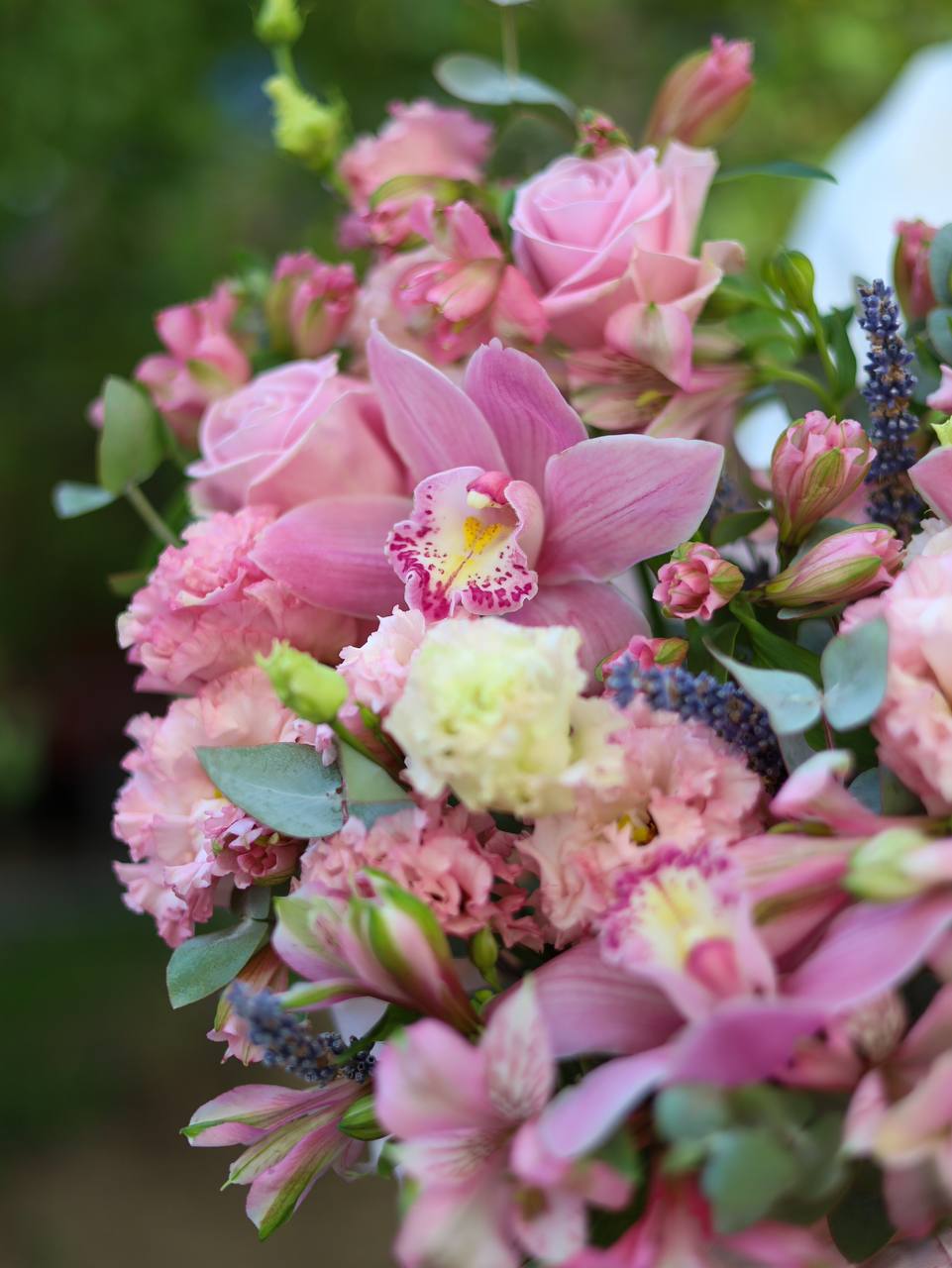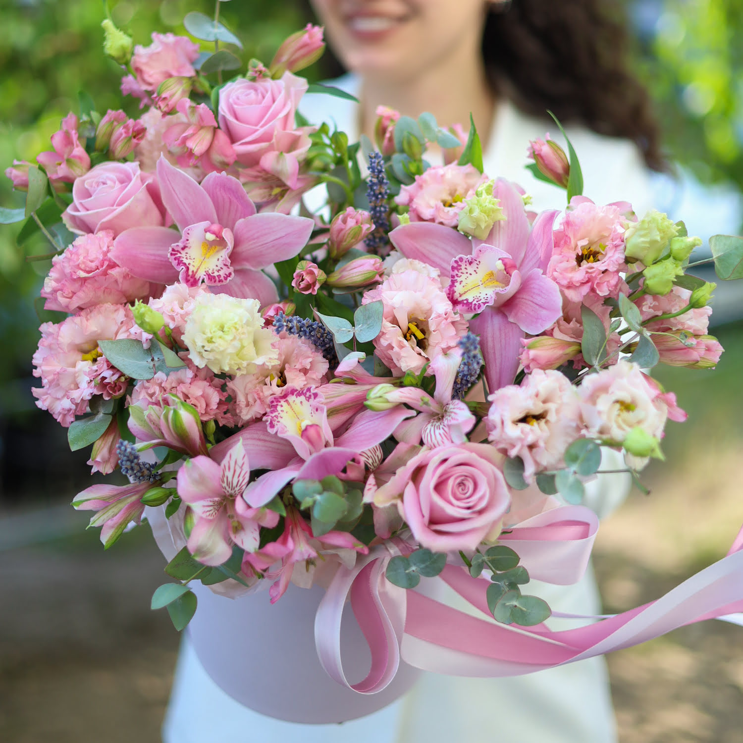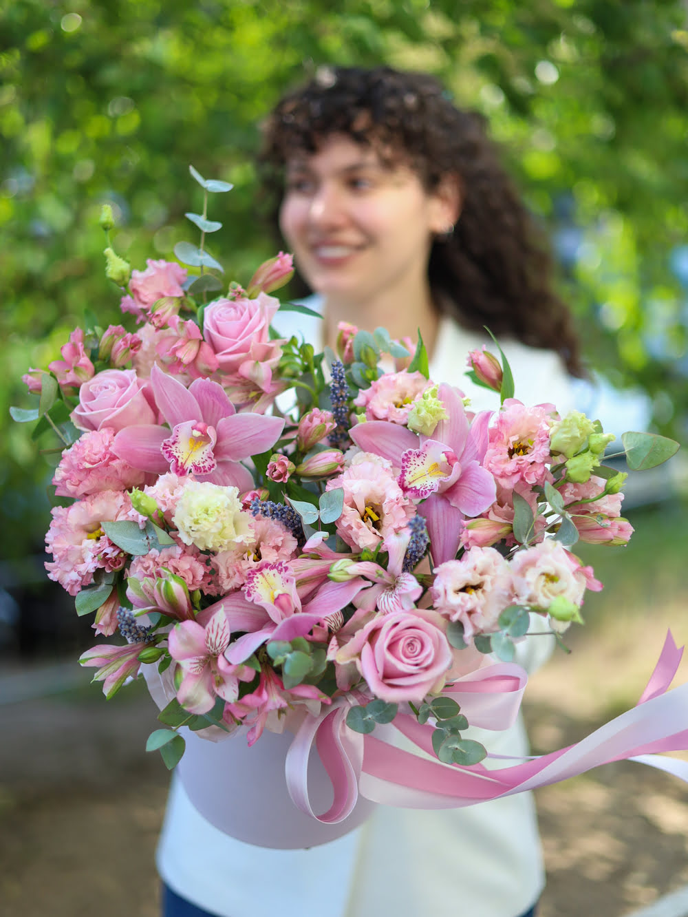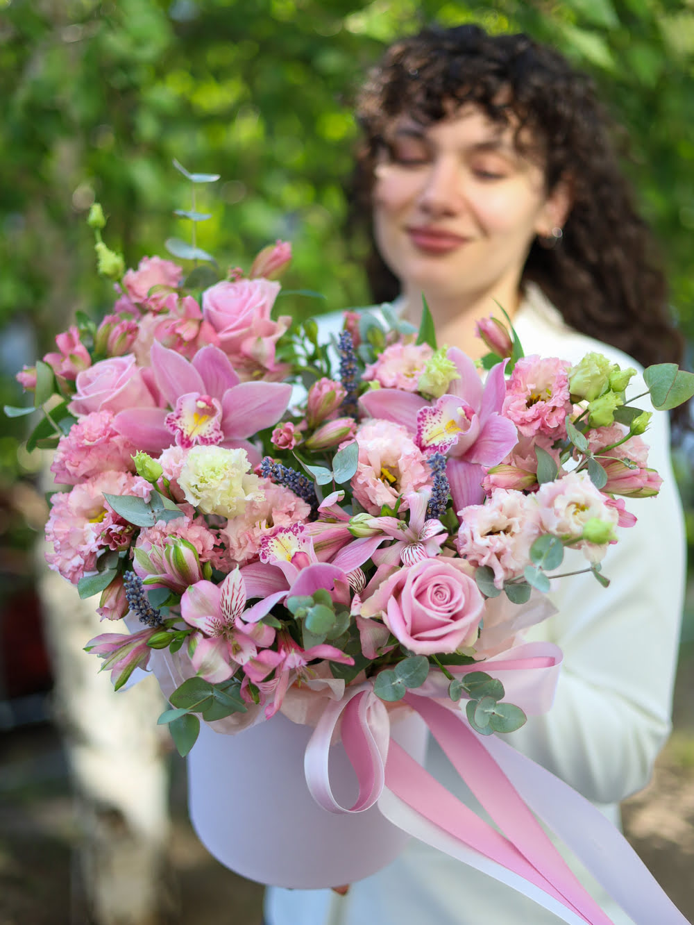 Состав: ажурная эустома, стойкие орхидеи и альстромерии, одноголовые розы, ароматная лаванда и эвкалипт.