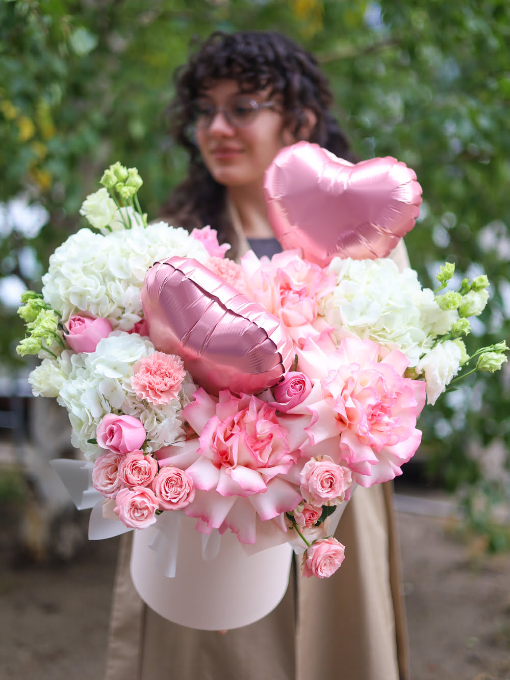 Роскошная авторская композиция в пастельной розово-белой гамме с шариками в шляпной коробке.