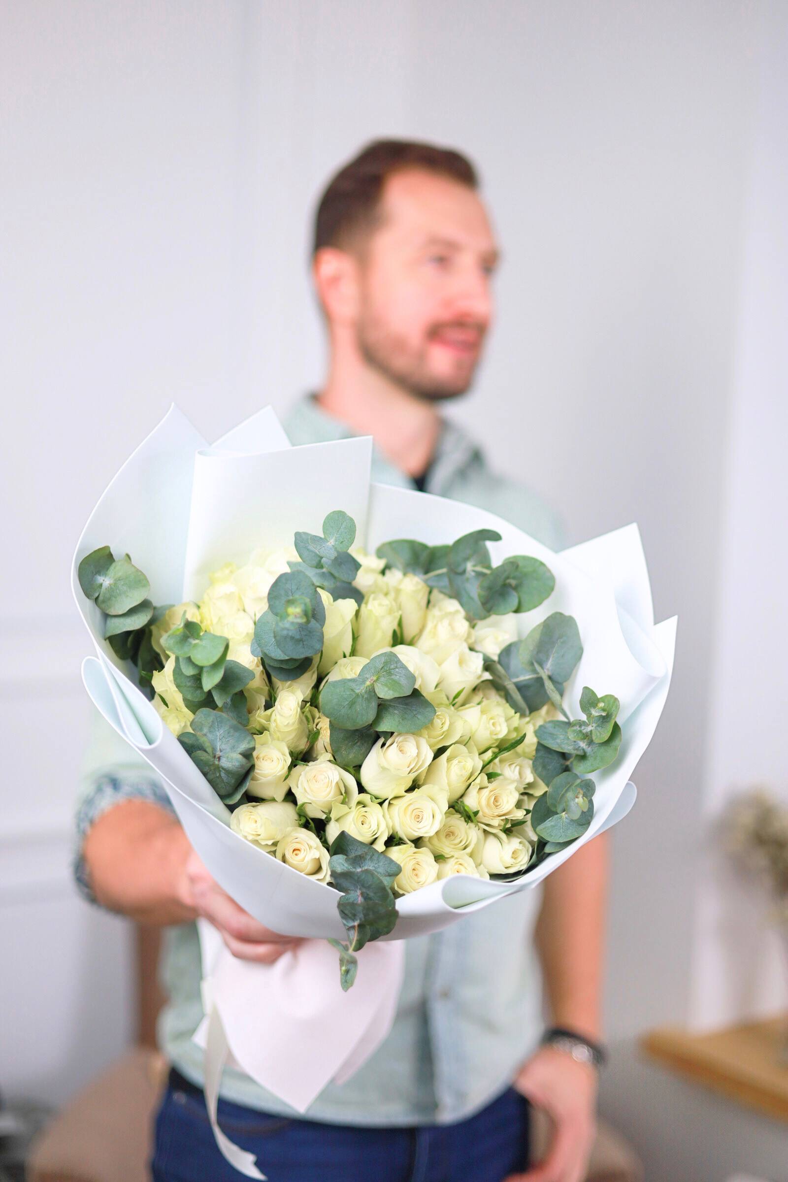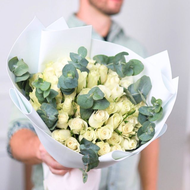 Букет из 51-ой белой розы с душистым эвкалиптом в стильном оформлении.