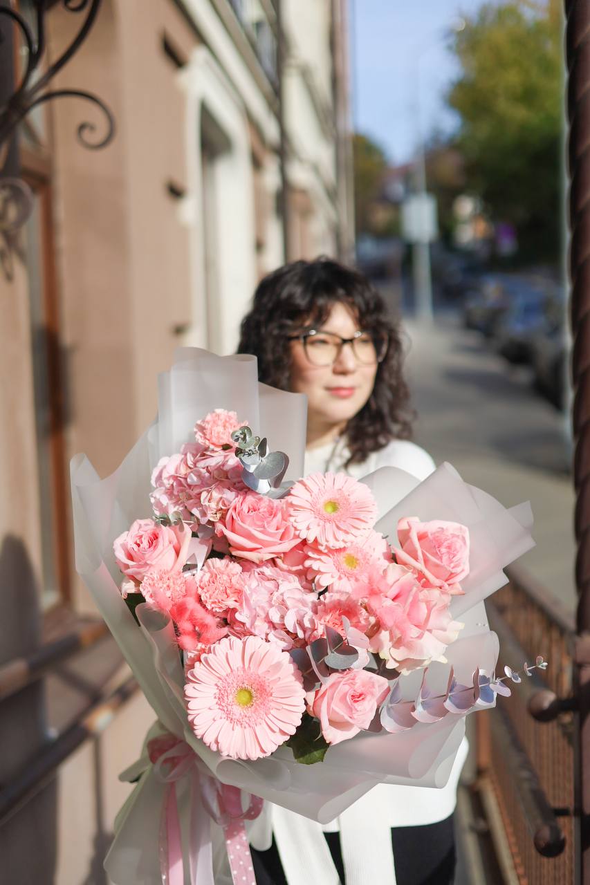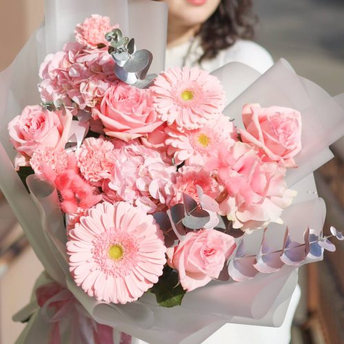 Букет пышной гортензии, пионовидных роз, гербер, французских роз, стойких диантусов, эвкалипта и лагуруса в оформлении.