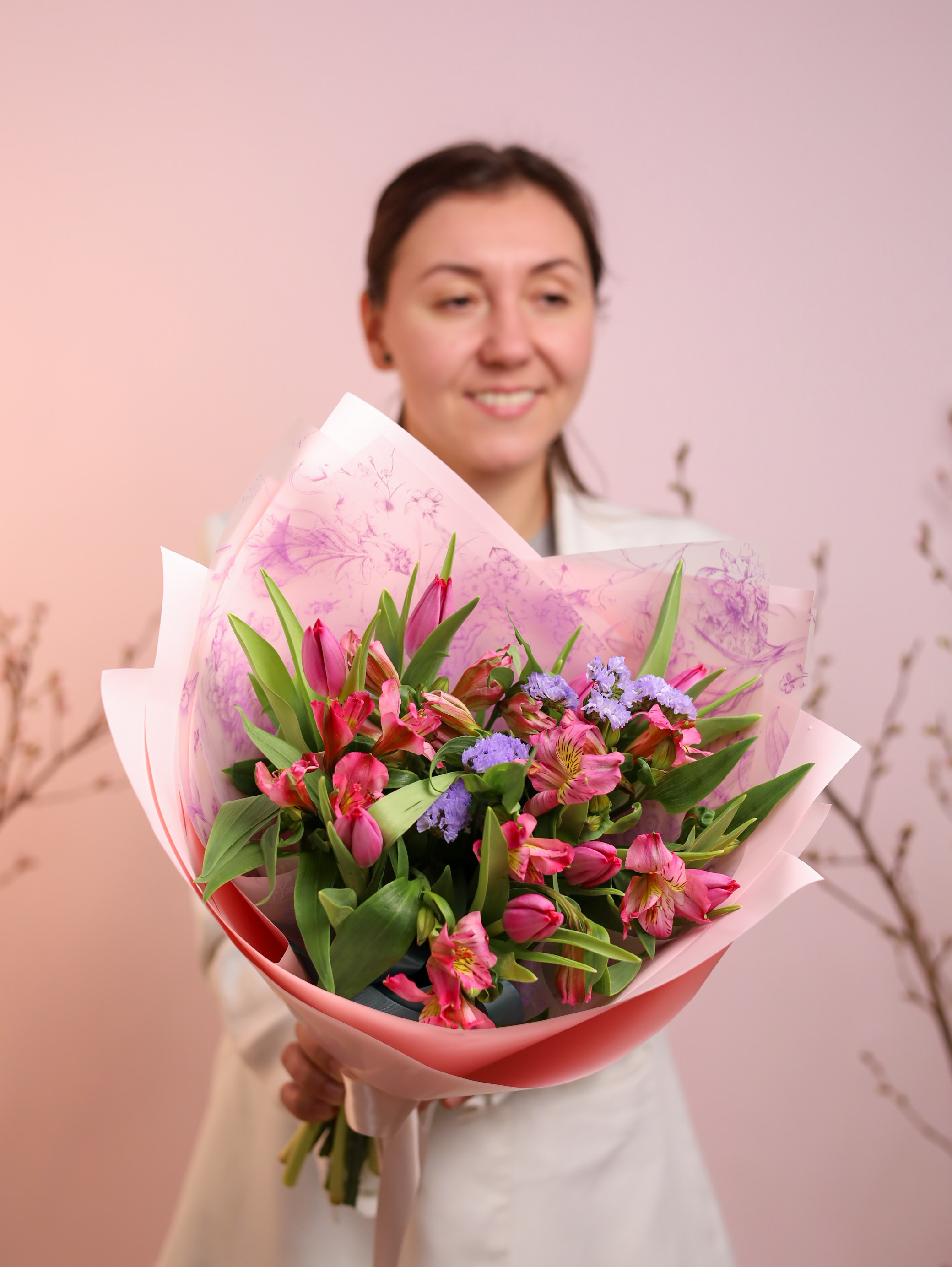 Красивый стойкий букет с тюльпанами, альстромерией и статицей.