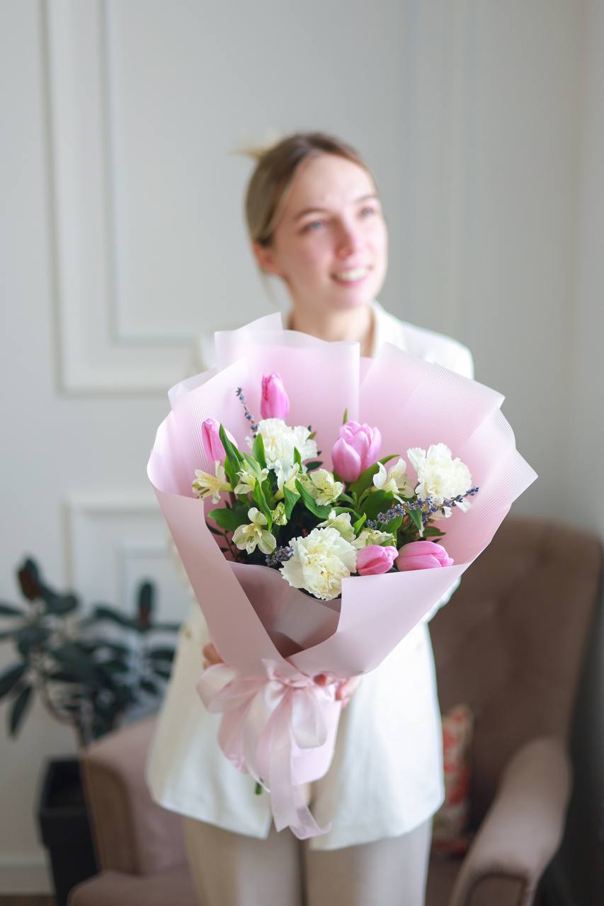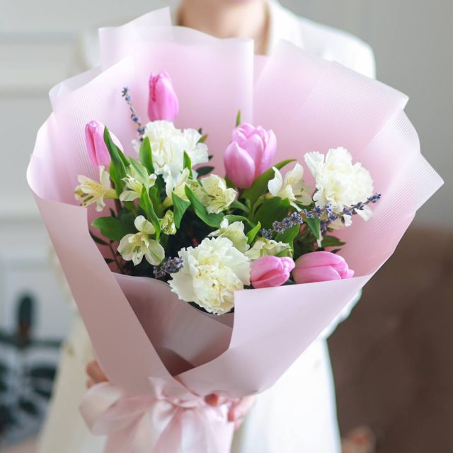 Состав: тюльпаны, стойкая альстромерия, диантусы, ароматная лаванда.