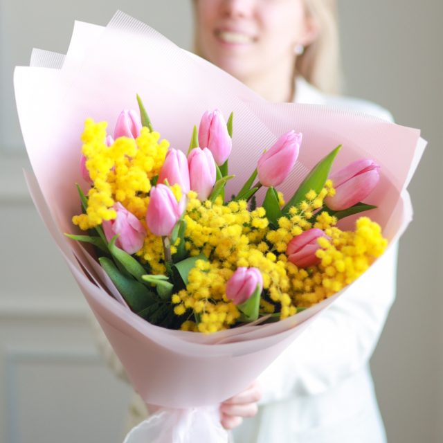 Весенний букет тюльпанов с мимозой