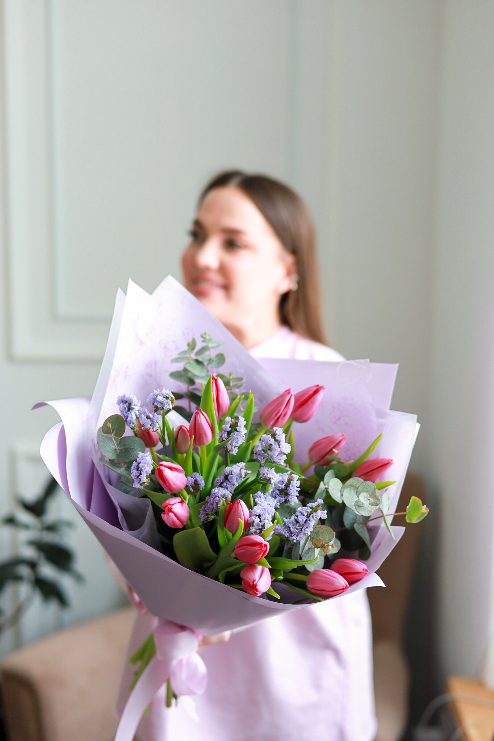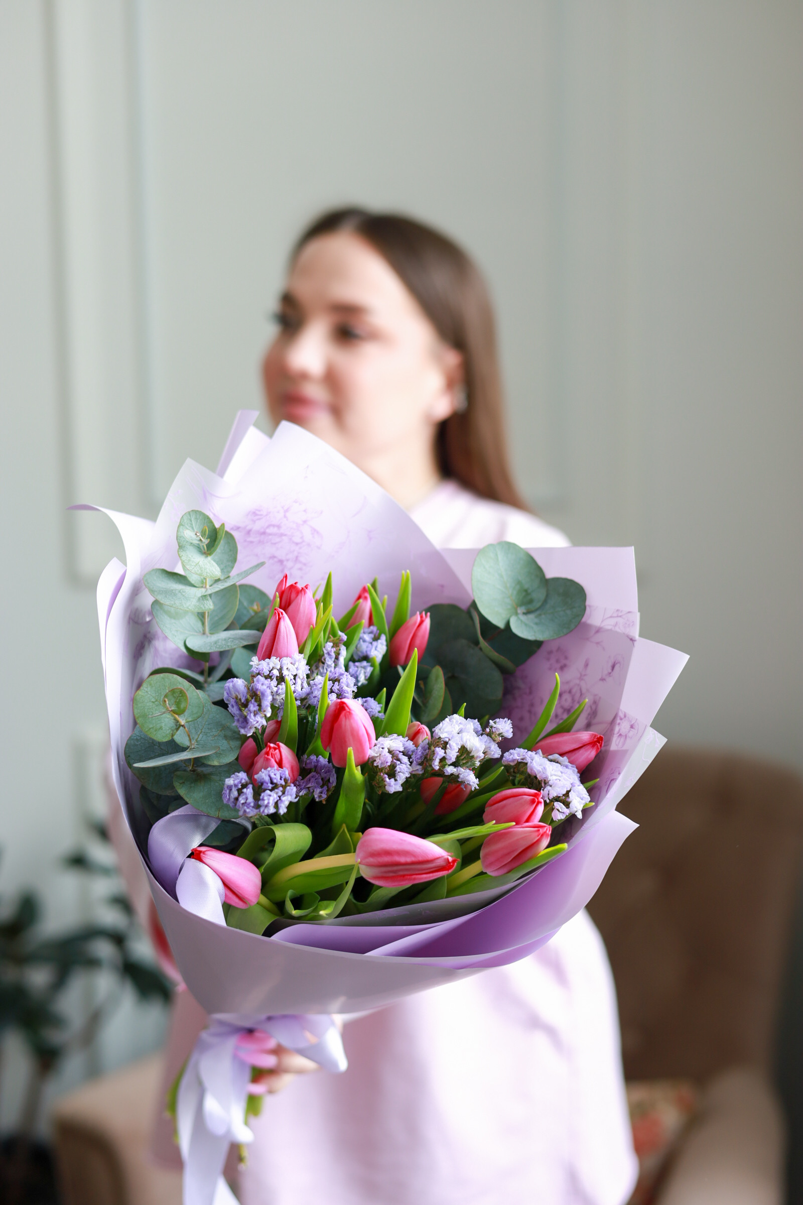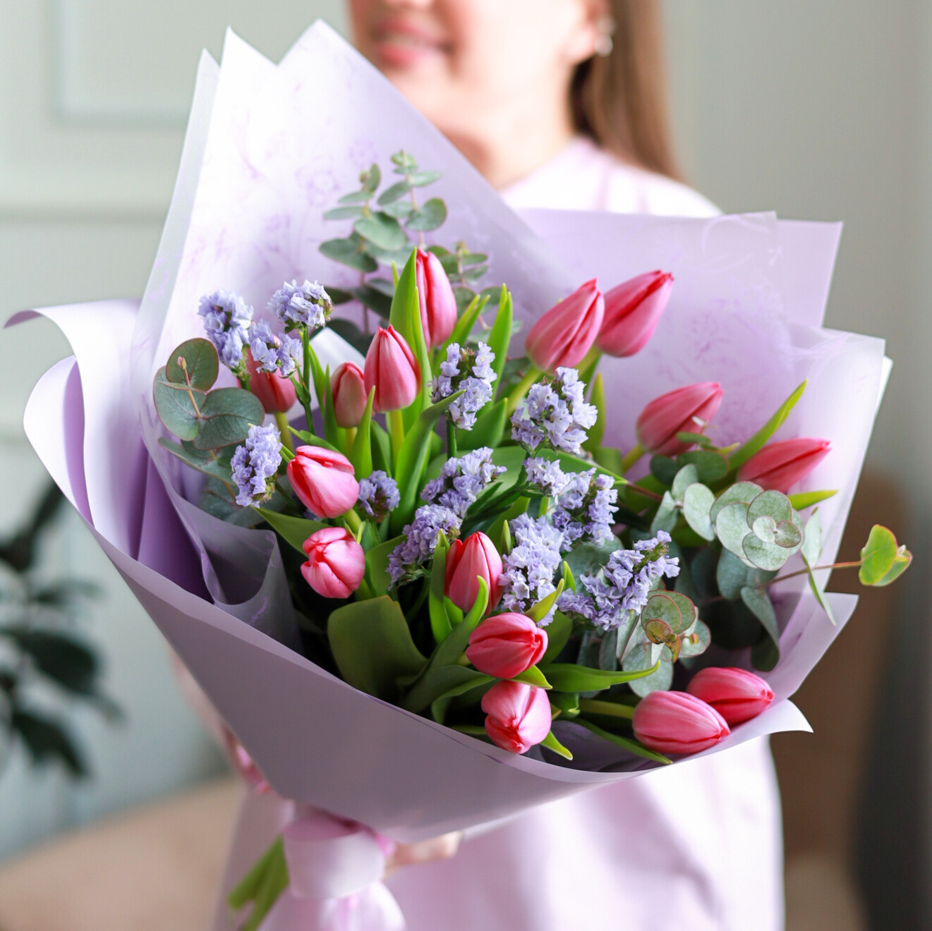 Очаровательный ароматный букет из 15-ти тюльпанов, статицы и эвкалипта.