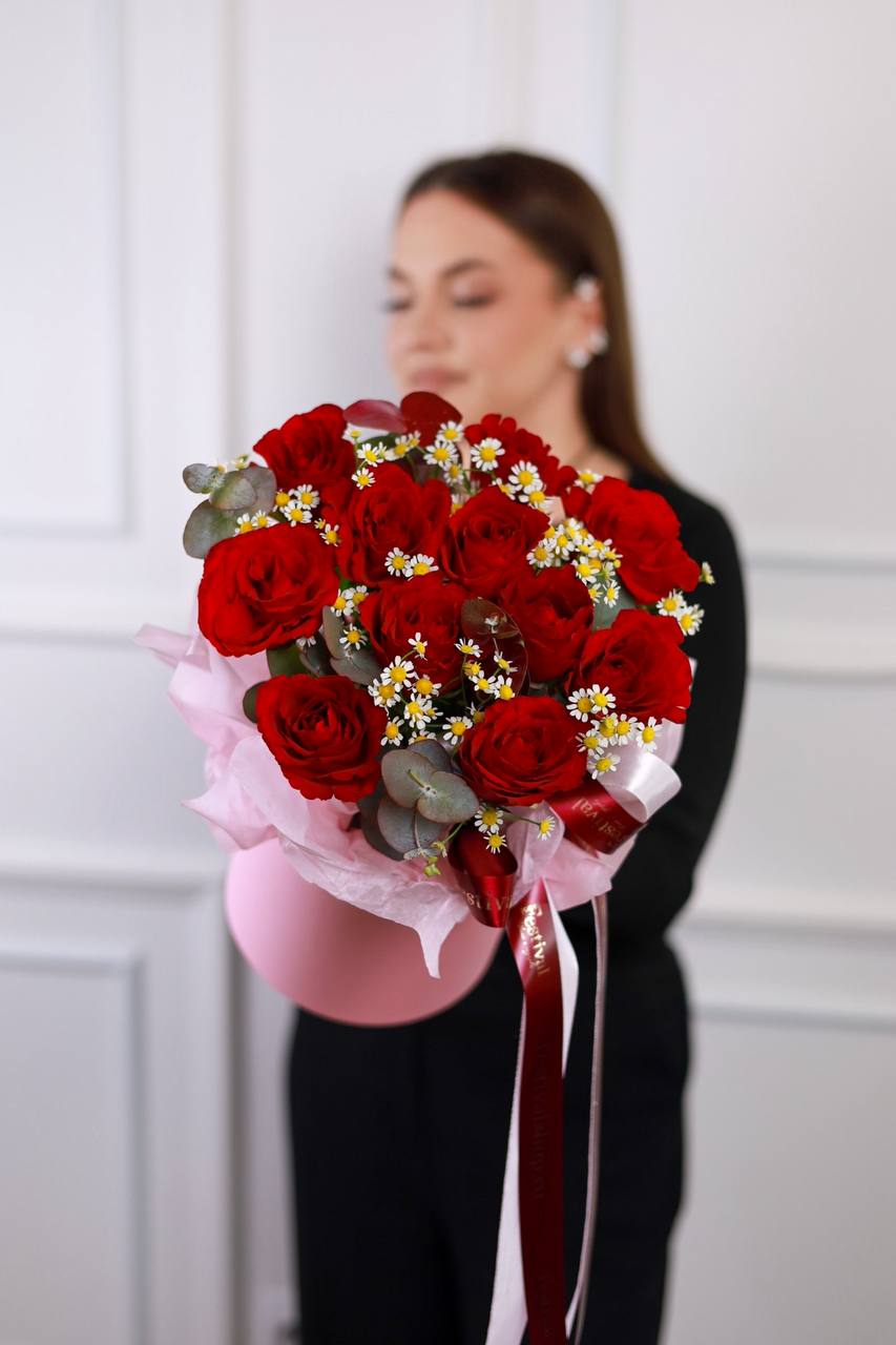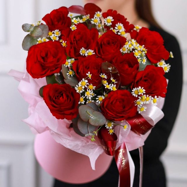 Композиция роз, ароматных ромашек и душистого эвкалипта в шляпной коробке.