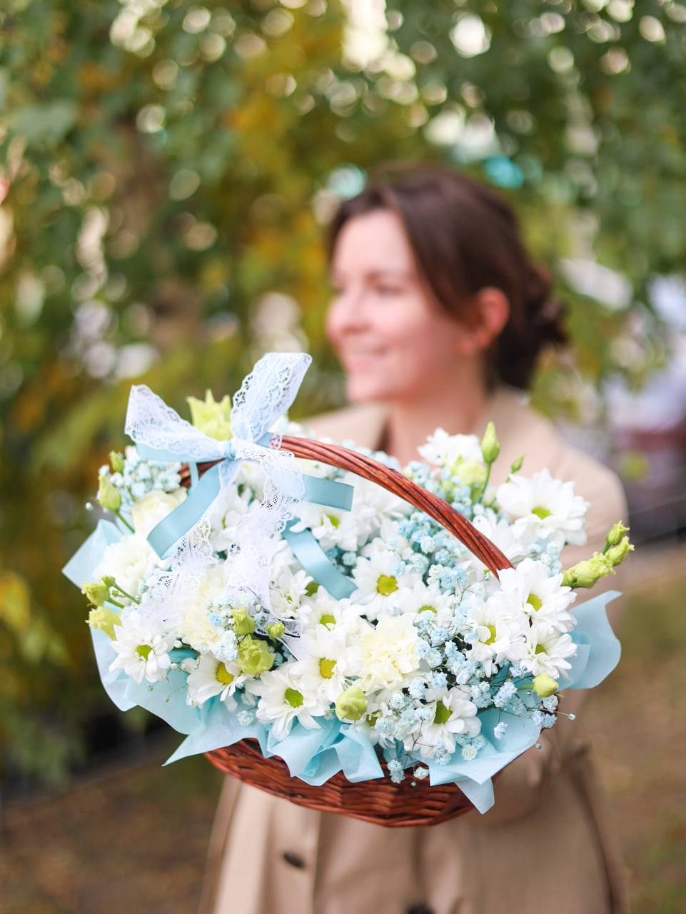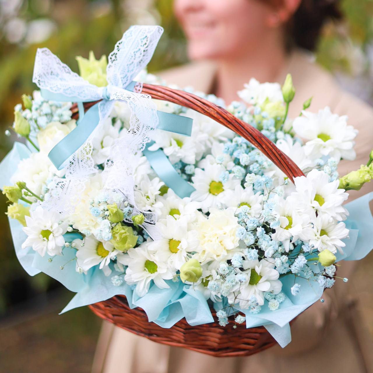 Композиция ажурной эустомы, хризантемы, стойких диантусов и воздушной гипсофилы в плетеной корзине.