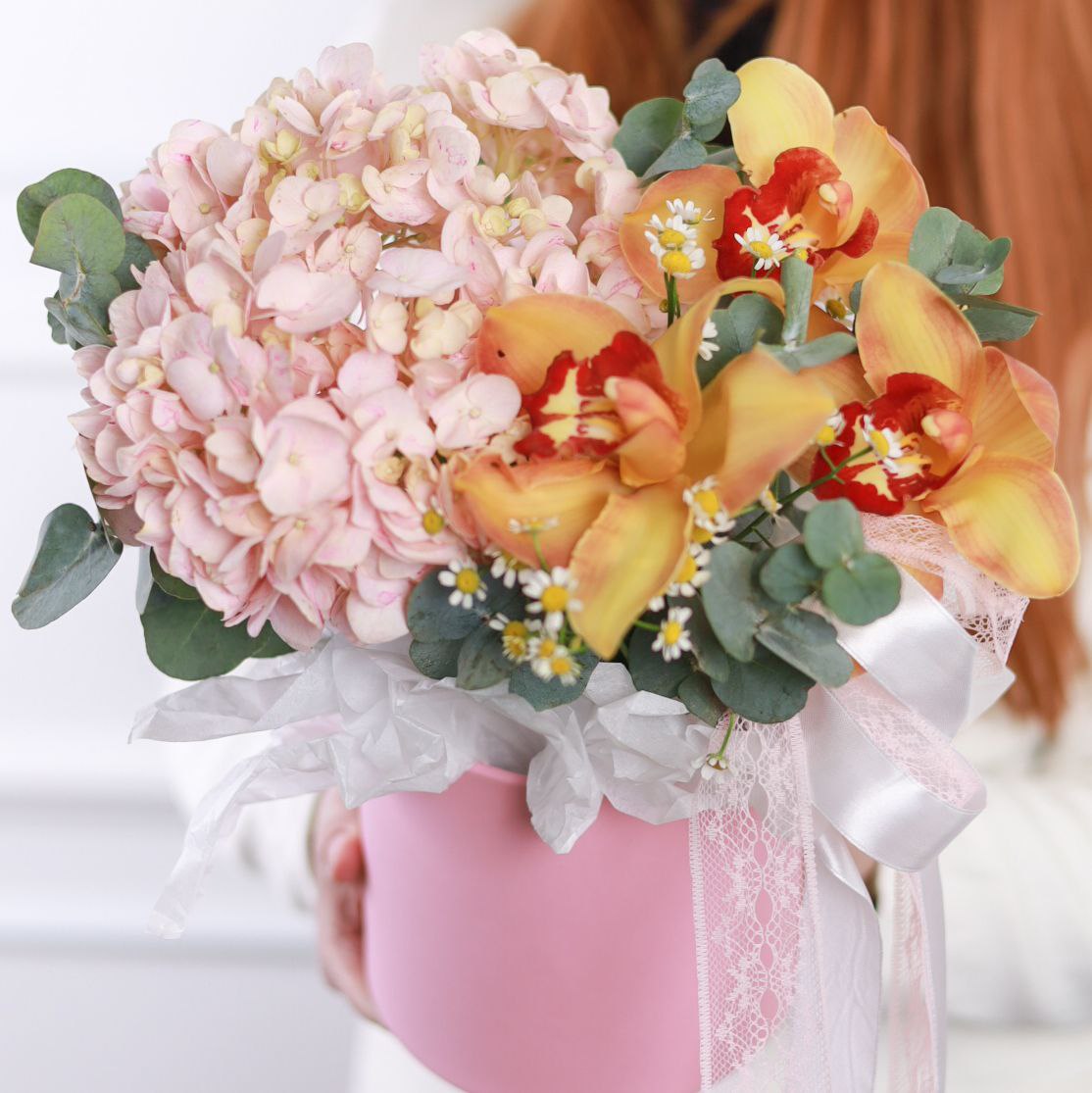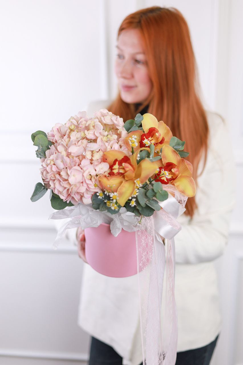 Композиция с орхидеей, воздушной гортензией, ароматной ромашкой и душистым эвкалиптом в шляпной коробке.