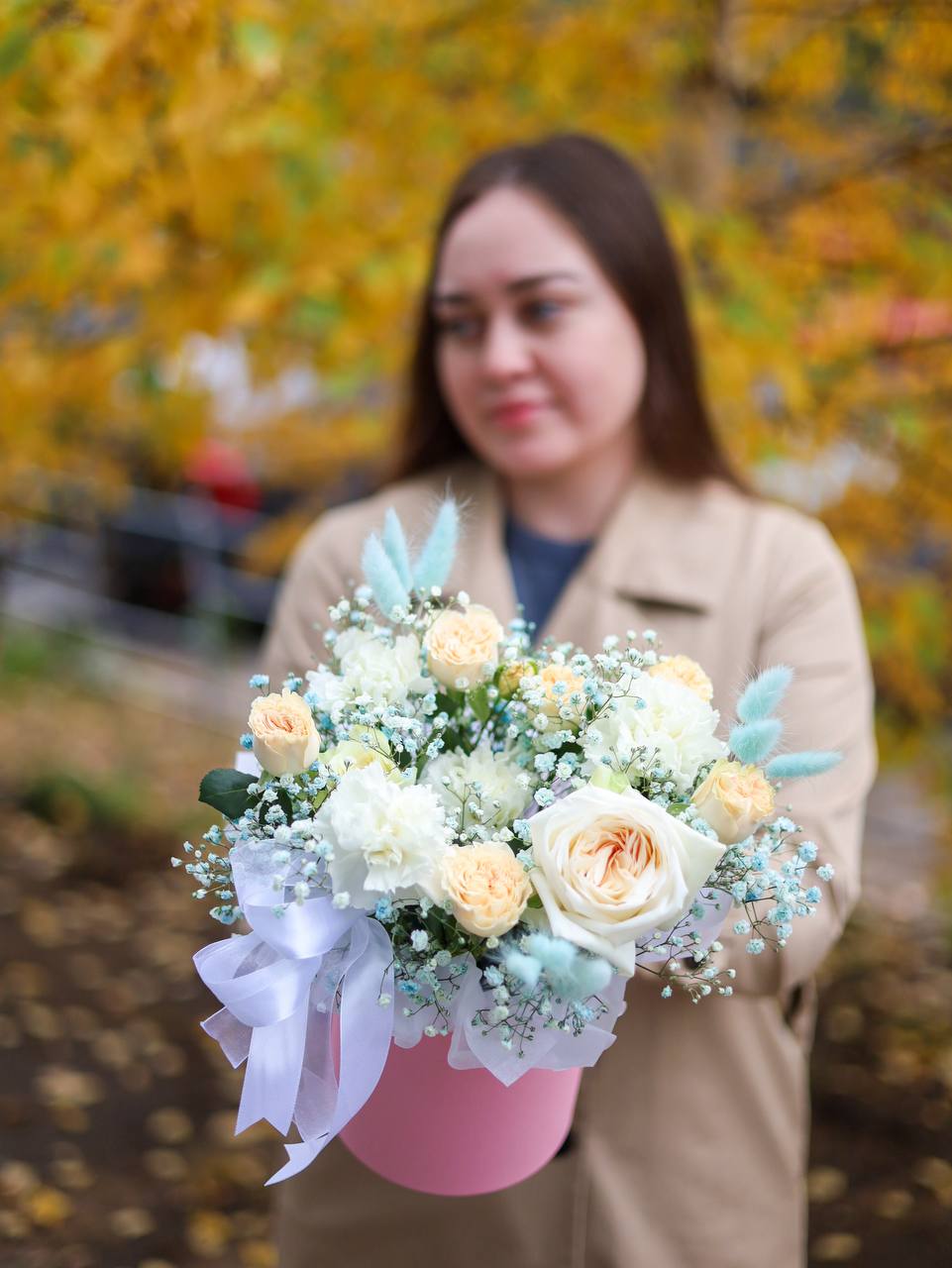 Композиция пионовидной розы, кустовых роз, стойких диантусов, лагуруса и стойкой гипсофилы в шляпной коробке.