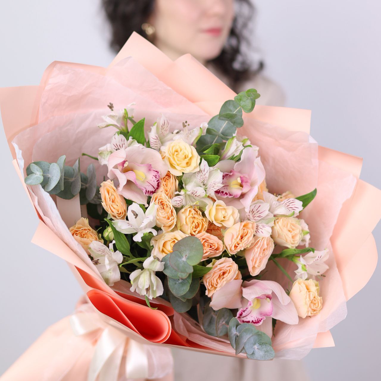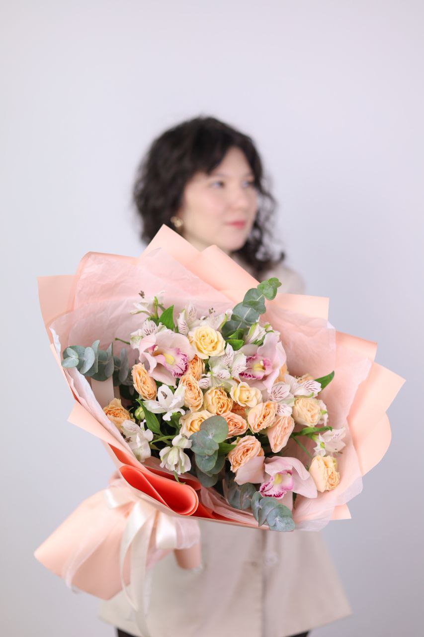 Букет с орхидеей, кустовой пионовидной розой, альстромерией и эвкалиптом в оформлении.