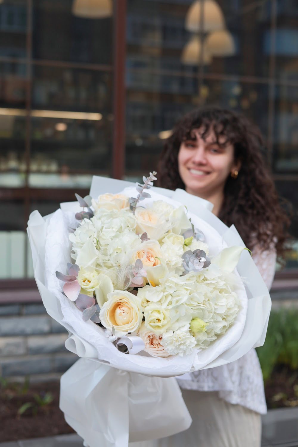 В букете: пышные гортензии, ажурная эустома, одноголовые пионовидные розы, каллы, сухоцветы, крашеный эвкалипт.