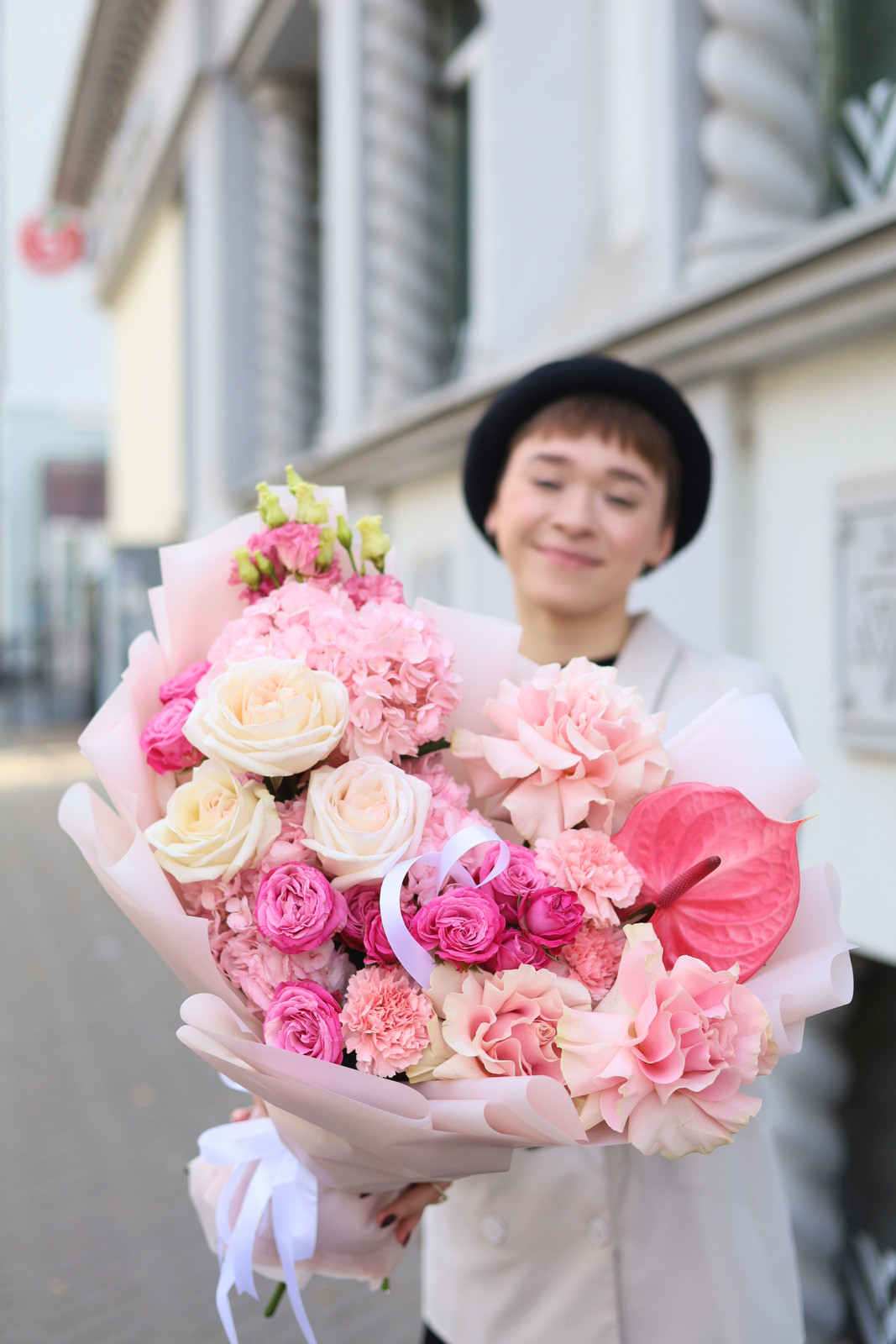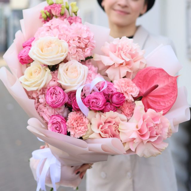 В букете: французские розы и кустовые пионовидные розы, пышные гортензии, стойкие диантусы, ажурная эустома, экзотический антуриум.