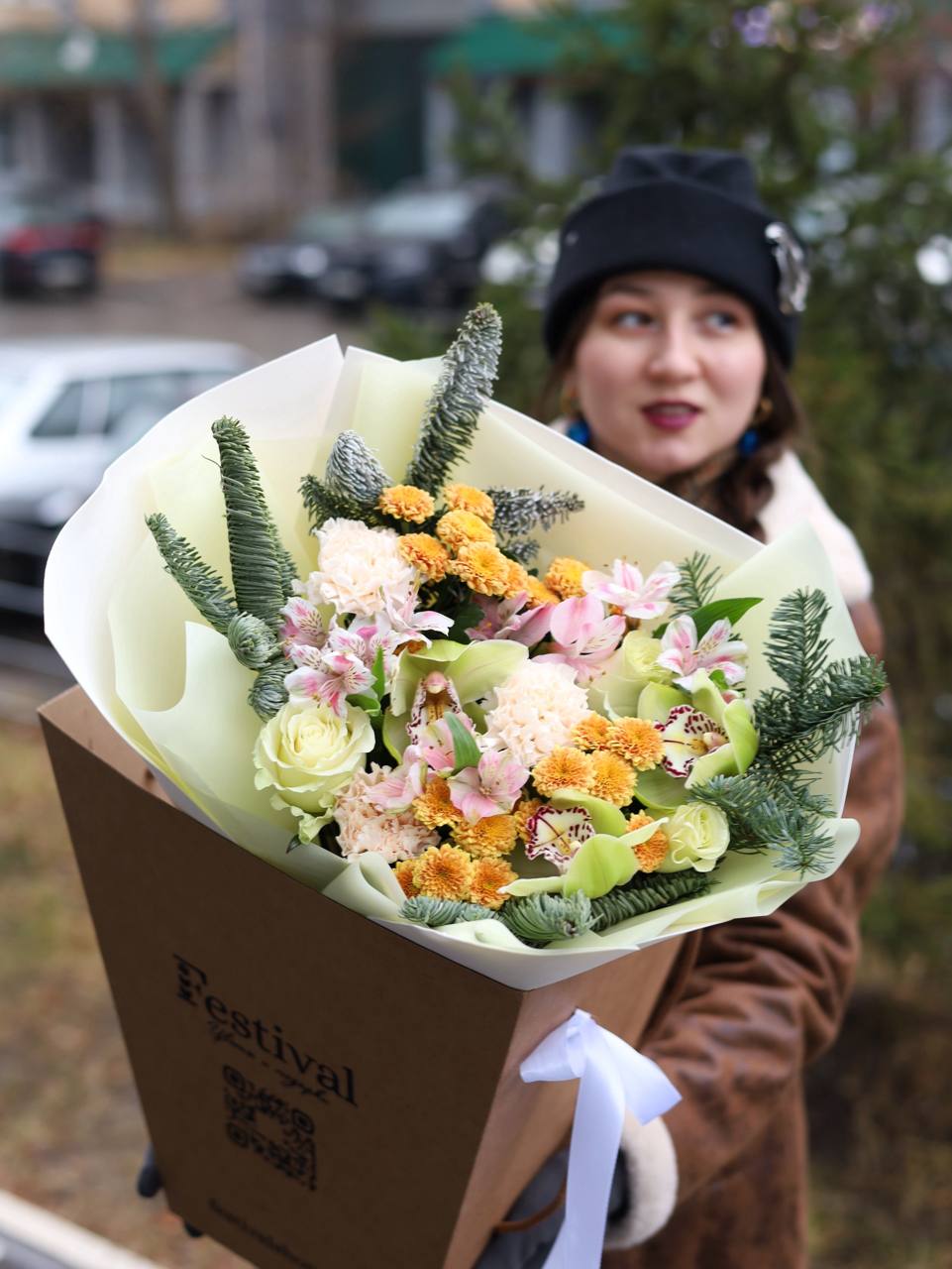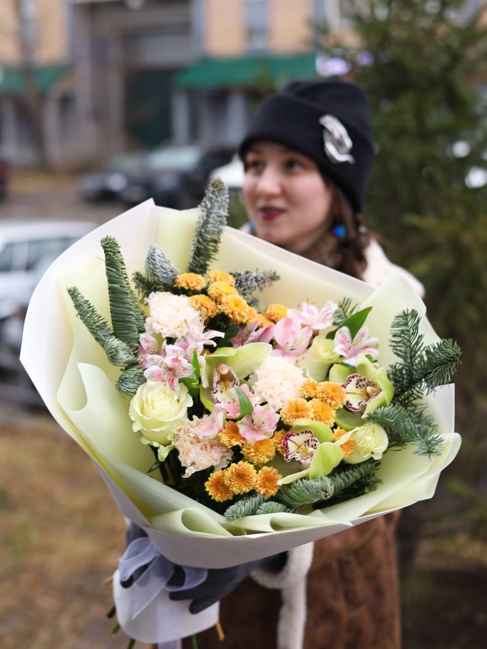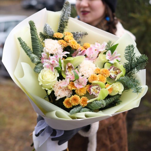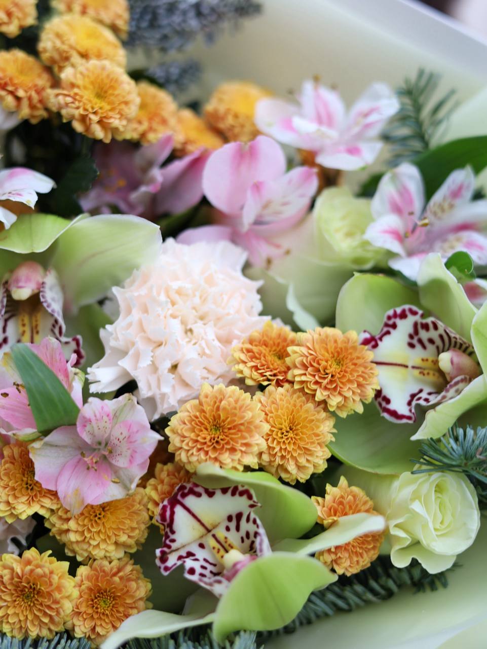 Прекрасный букет стойкой альстромерии, диантусов, хризантем сантини, одноголовых роз, тропических орхидей и нобилиса в оформлении.