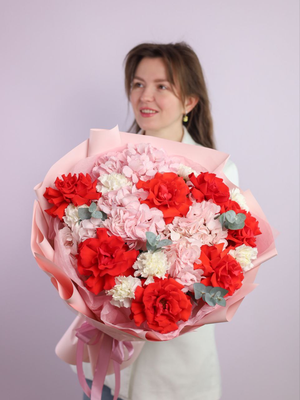 Букет с пышной гортензией, французской розой, душистым эвкалиптом и стойким диантусом в оформлении.