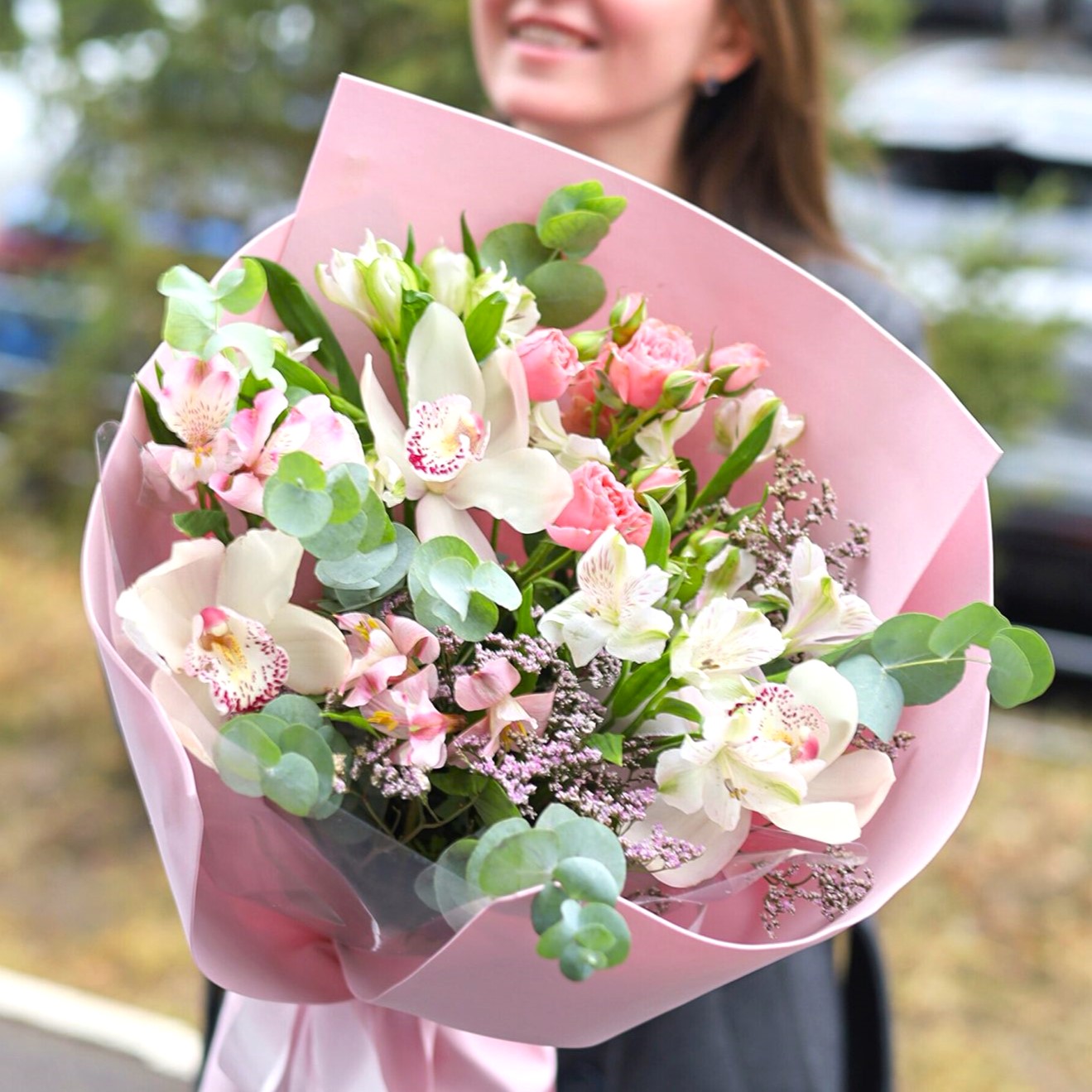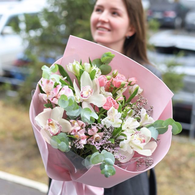 Состав: кустовые розы, стойкие орхидеи, альстромерия, лимониум и эвкалипт.