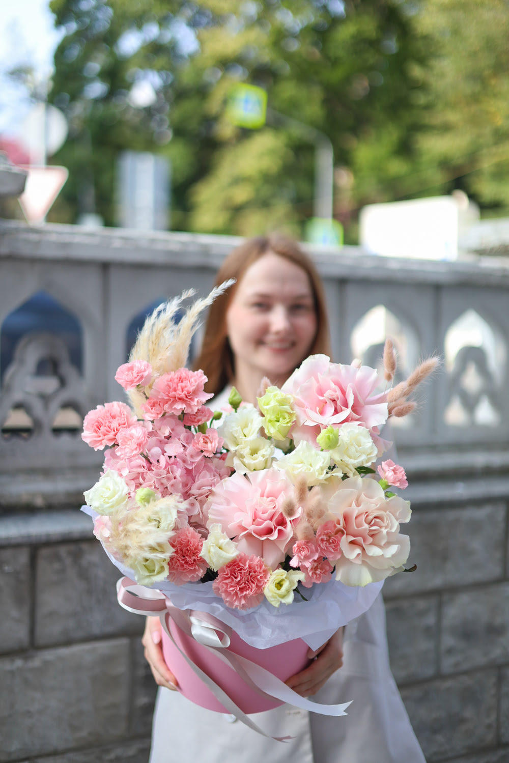 Великолепная нежная композиция в шляпной коробке в розовой гамме.