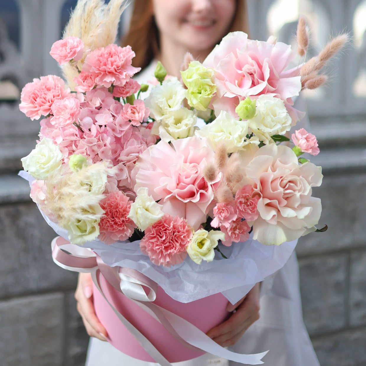 Состав: французские розы, стойкие диантусы, гортензия, ажурная эустома, сухоцветы.