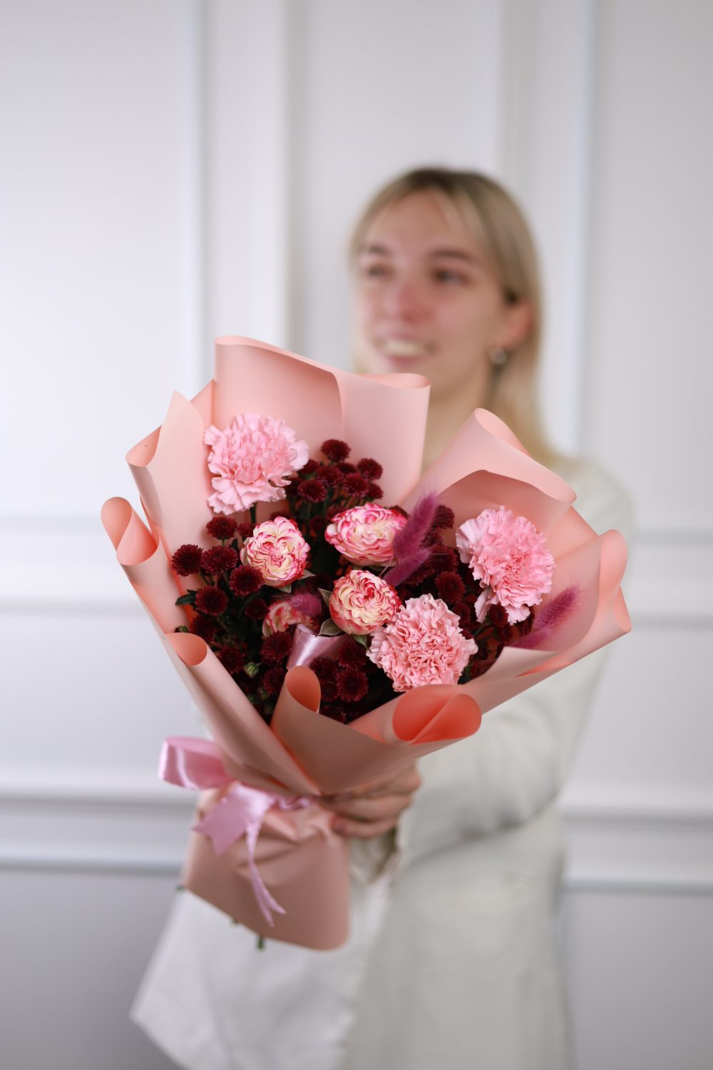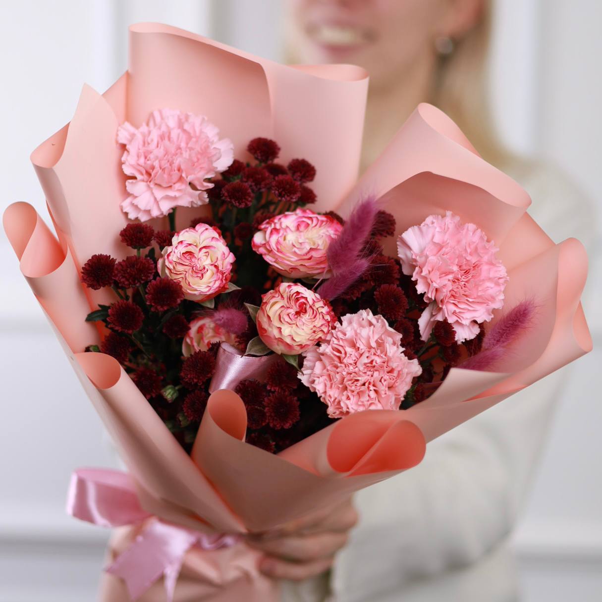 Букет со стойкими диантусами, хризантемой, кустовыми пионовидными розами и лагуросом в оформлении.
