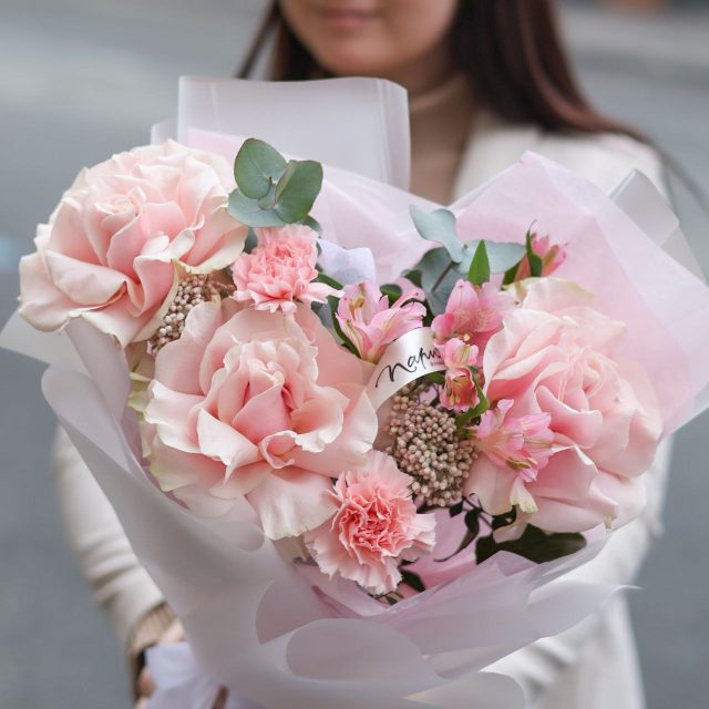 Букет с французской розой, озотамнусом, стойкой альстромерией в оформлении.