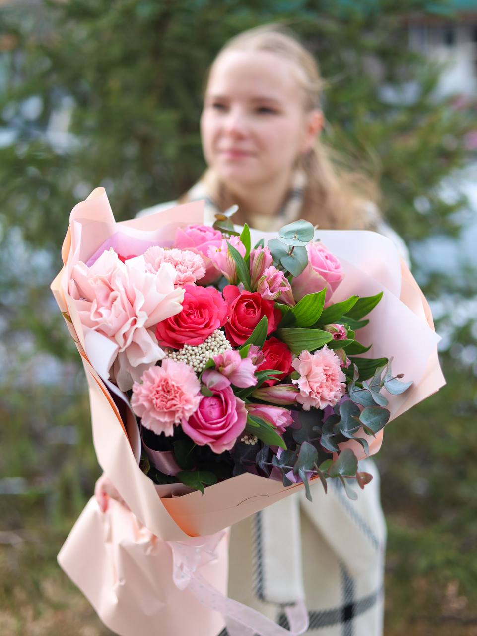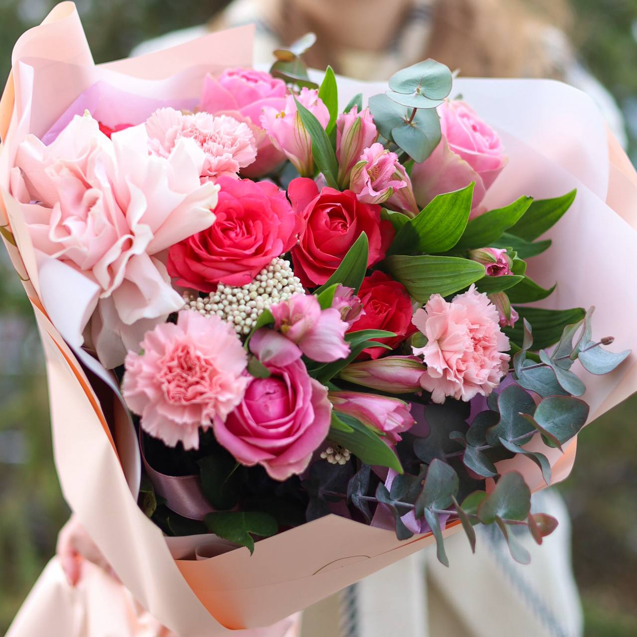 Букет французской розы, кустовых пионовидных роз, одноголовых роз, стойких диантусов, альстромерии, озотамнуса и душистого эвкалипта в оформлении.