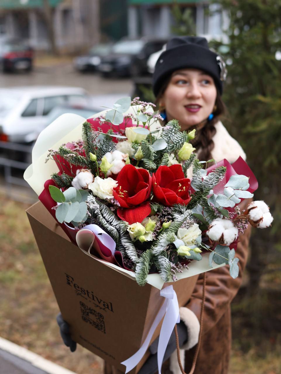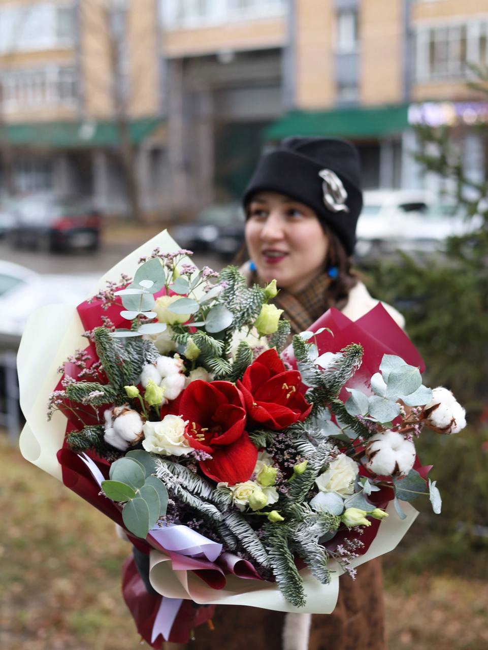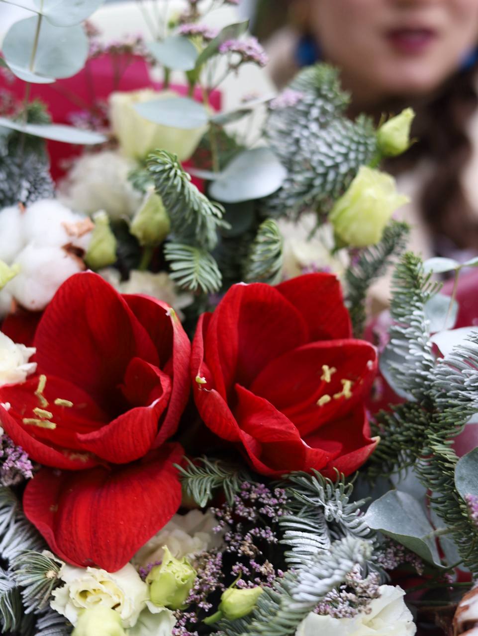 Букет с амариллисом, ажурной эустомой, ветками натурального хлопка, датской елью и декоративным наполнителем.